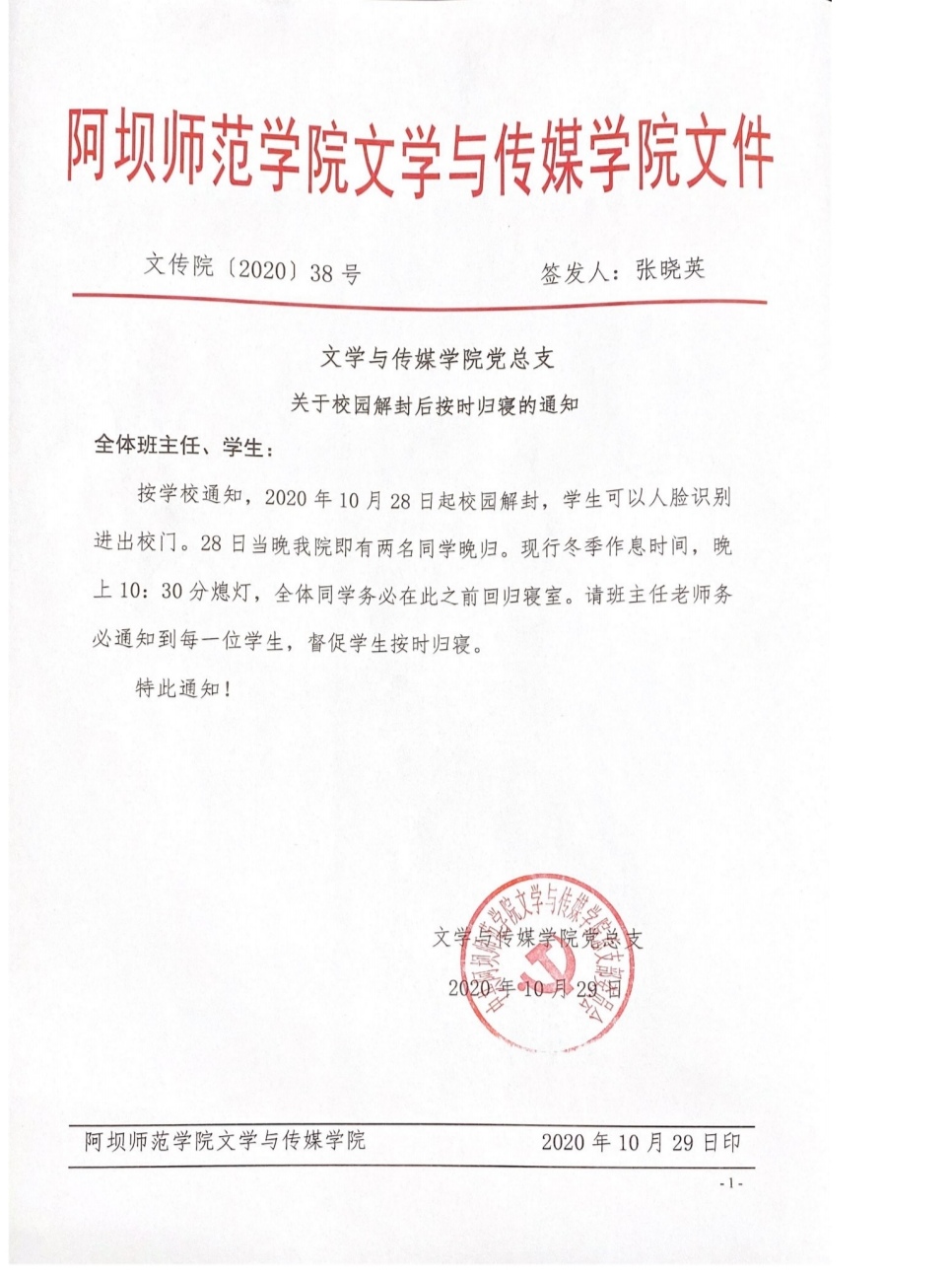 文学与传媒学院党总支关于校园解封后按时归寝的通知