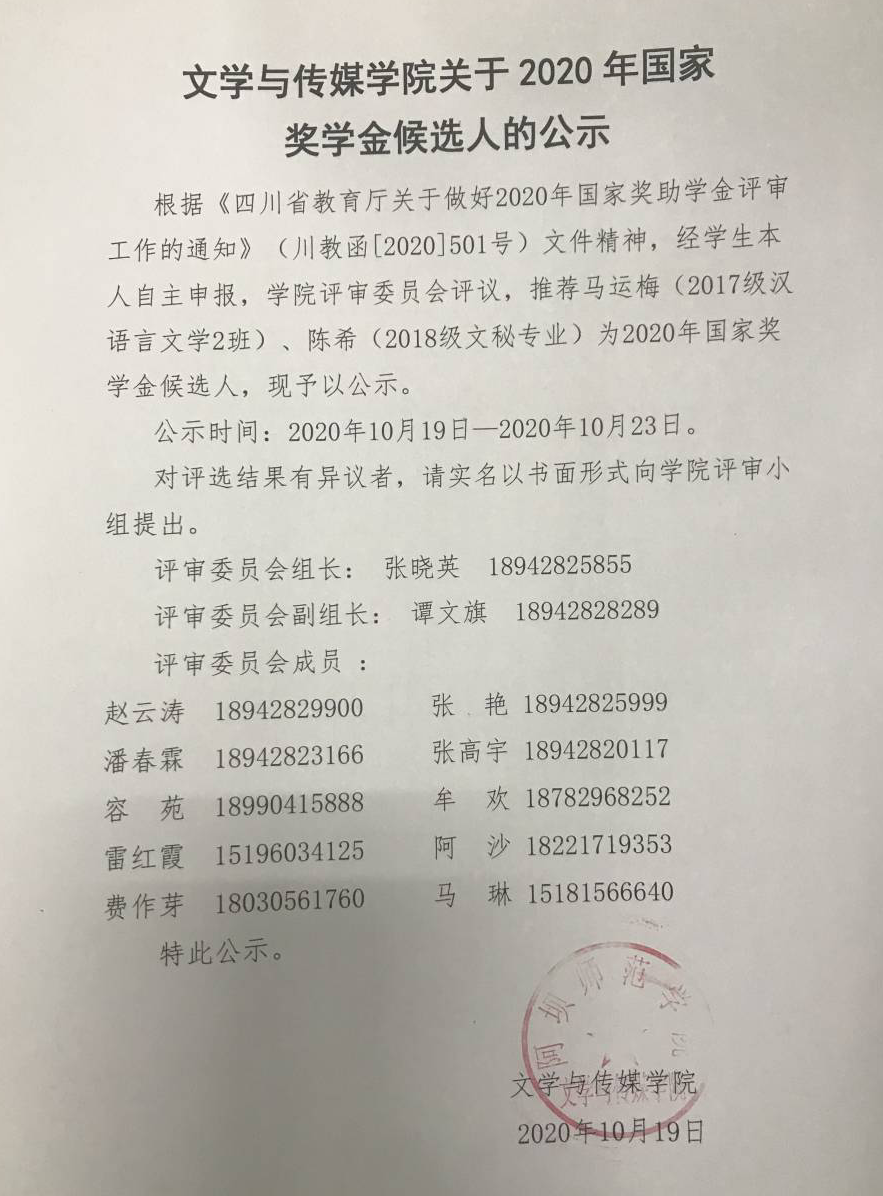根据《四川省教育厅关于做好2020年国家奖助学金评审工作的通知》(川教函[2020]501号)文件精神,经学生本人自主申报,学院评审委员会评议,推荐马运梅(2017级汉语言文学2班)、陈希(2018级文秘专业)为2020年国家奖学金候选人,现予以公示。