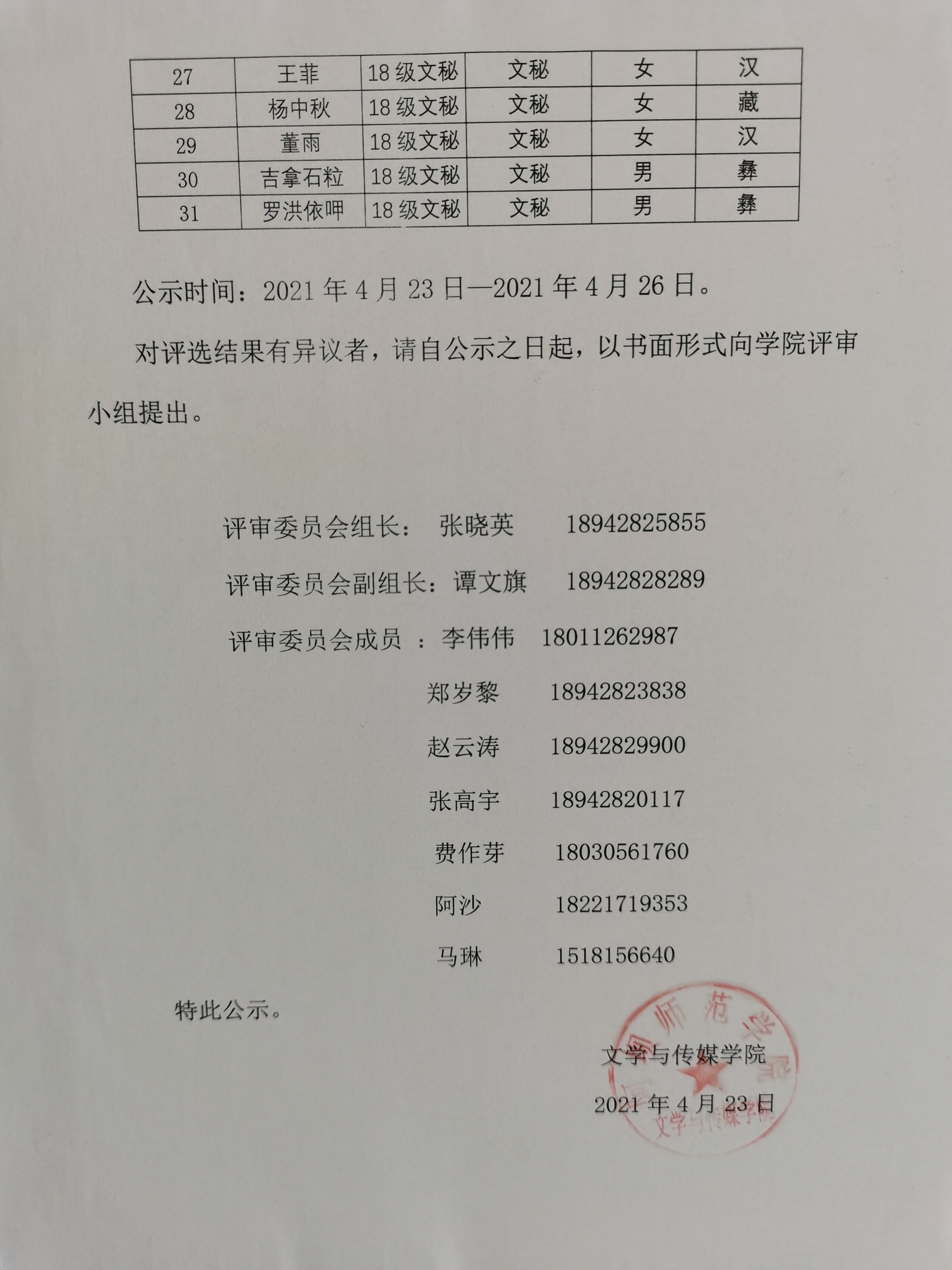 文学与传媒学院2020-2021学年“五四”评选结果公示