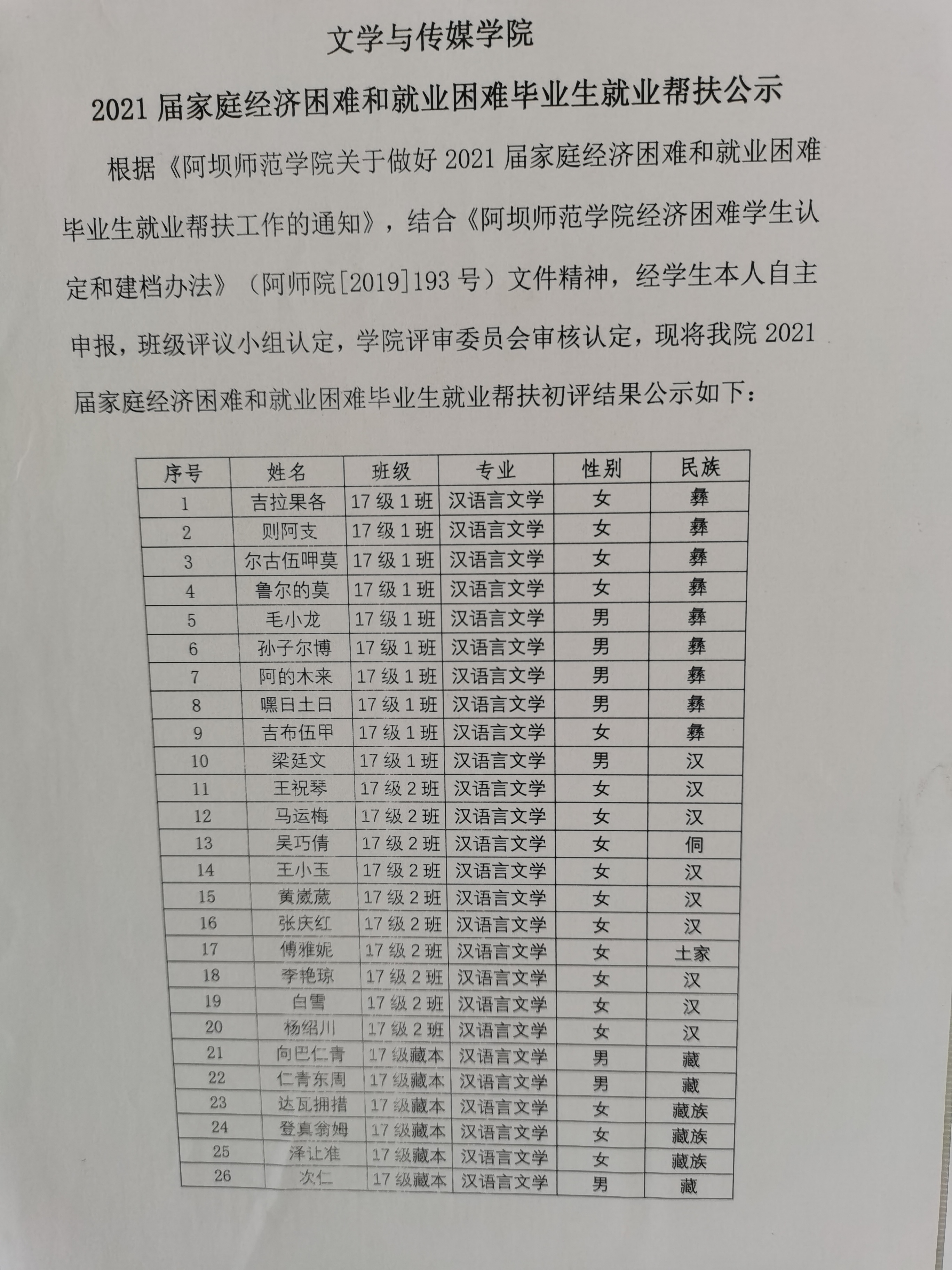 文学与传媒学院2021届家庭经济困难和就业困难毕业生就业帮扶公示