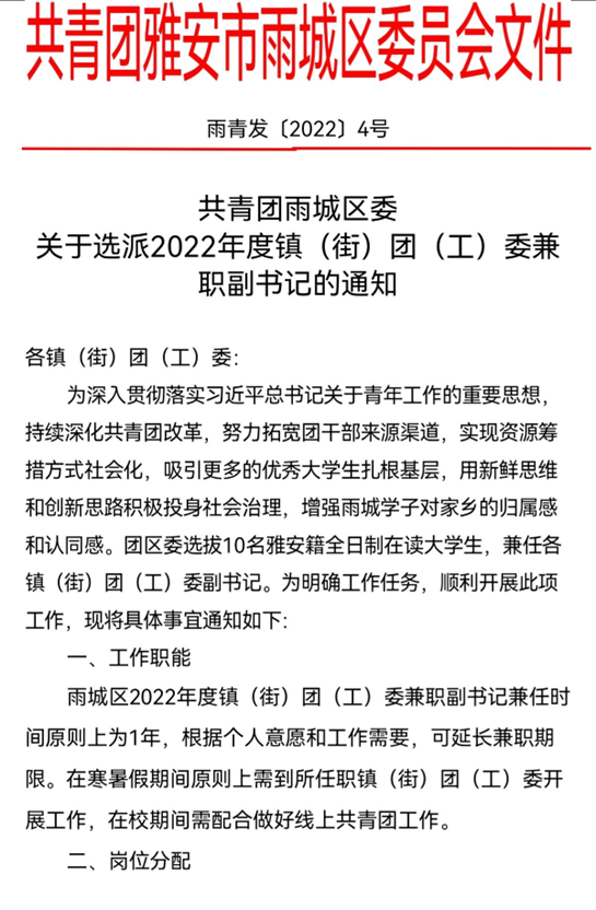 此次面向大学生团员选配镇(街道)兼职团干部的“统选兼用”展工作是共青团雅安市雨城区委为扎实推进县域共青团基层组织改革相关工作,加强团校合作培养优秀青年,搭建青年成长锻炼平台,为基层团组织规范化建设增强工作力量,吸引优秀青年大学生参与家乡建设,帮助大学生认识基层,了解基层、提升素质、增长才干,按照团中央、团省委相关要求开展的,共选拔了10名雅安籍全日制在读大学生,兼任各镇(街)团(工)委副书记。