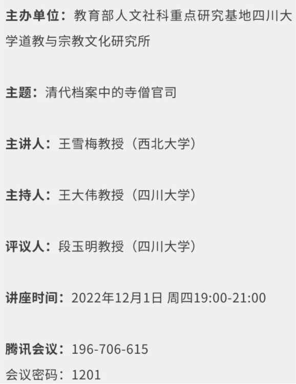 学术讲座预告:王雪梅 清代档案中的寺僧官司