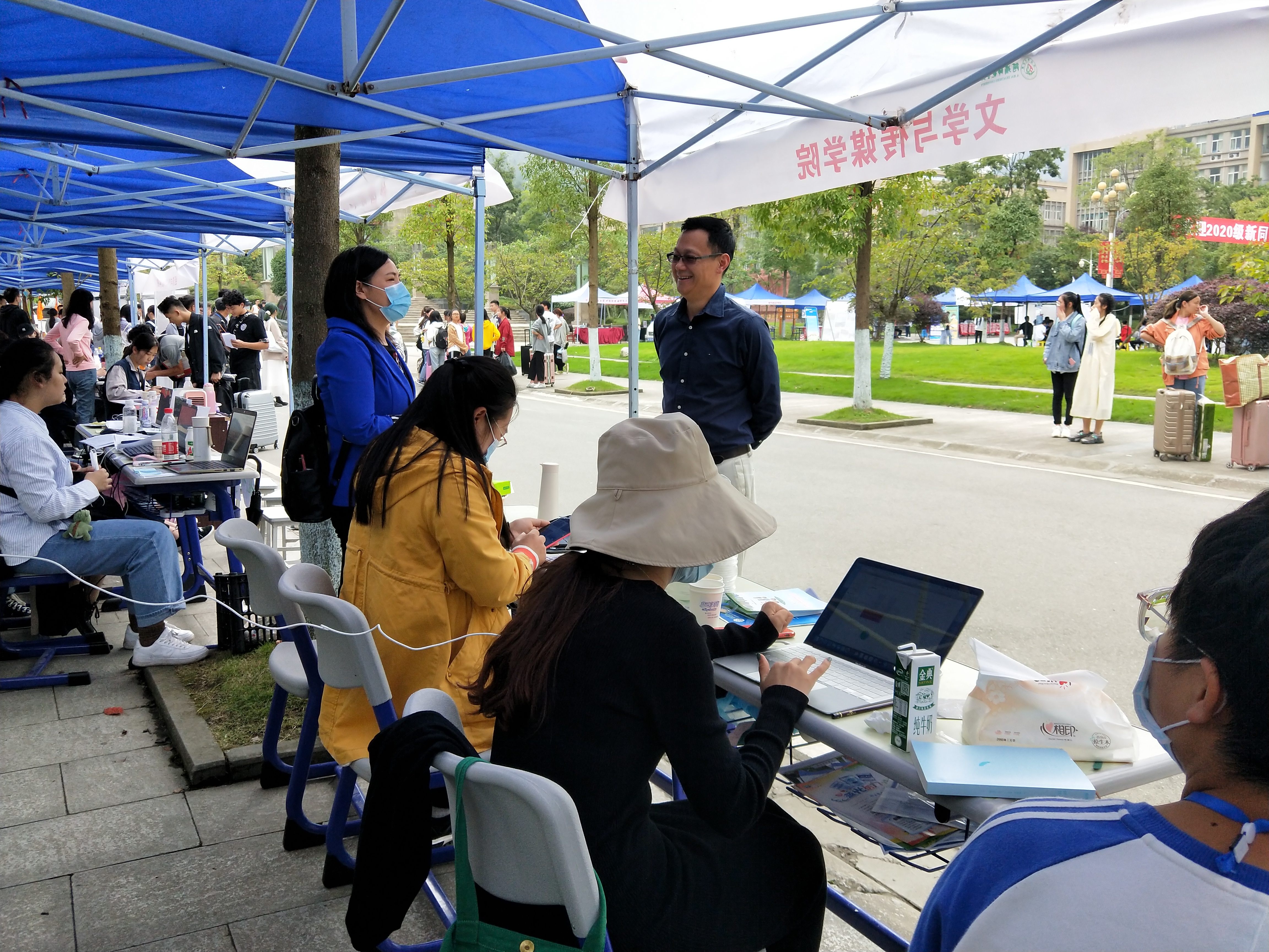 【本网讯】金秋九月,丹桂飘香。9月15日,文学与传媒学院2020级新生报到的第一天,党委组织部部长刘伟来到我院迎新点,巡查指导工作。在文学与传媒学院书记张晓英教授、辅导员阿沙老师、费作芽老师、马琳老师的陪同下,他看望了2020级新生,以及慰问迎新工作人员和各班学生志愿者。