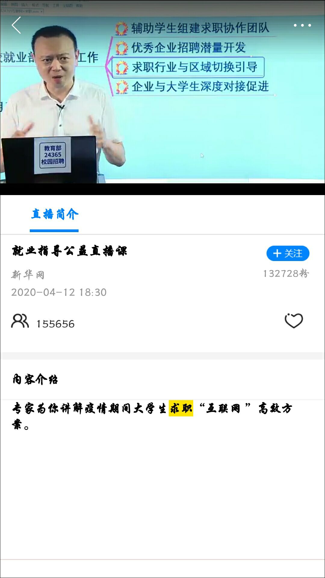 【本网讯】新冠肺炎疫情考验着我们社会的各个方面,同样,也包括各高校准毕业生的就业能力。2020年4月12日下午7时,文学与传媒学院2020届全体学生响应阿坝师范学院的号召,观看了由全国高等学校学生信息咨询与就业指导中心主办的张锐专家主讲的就业指导公益直播课。