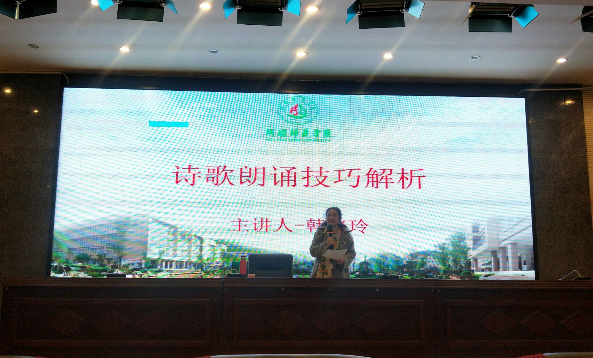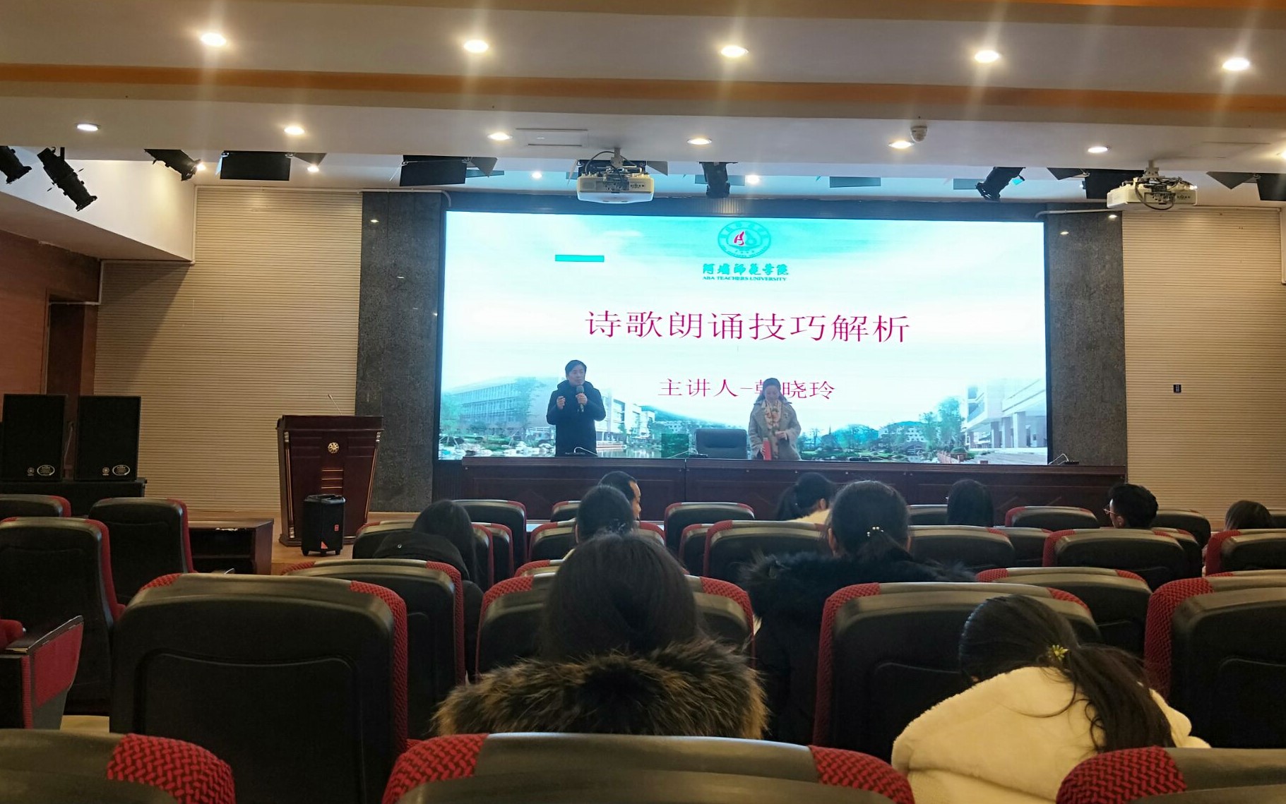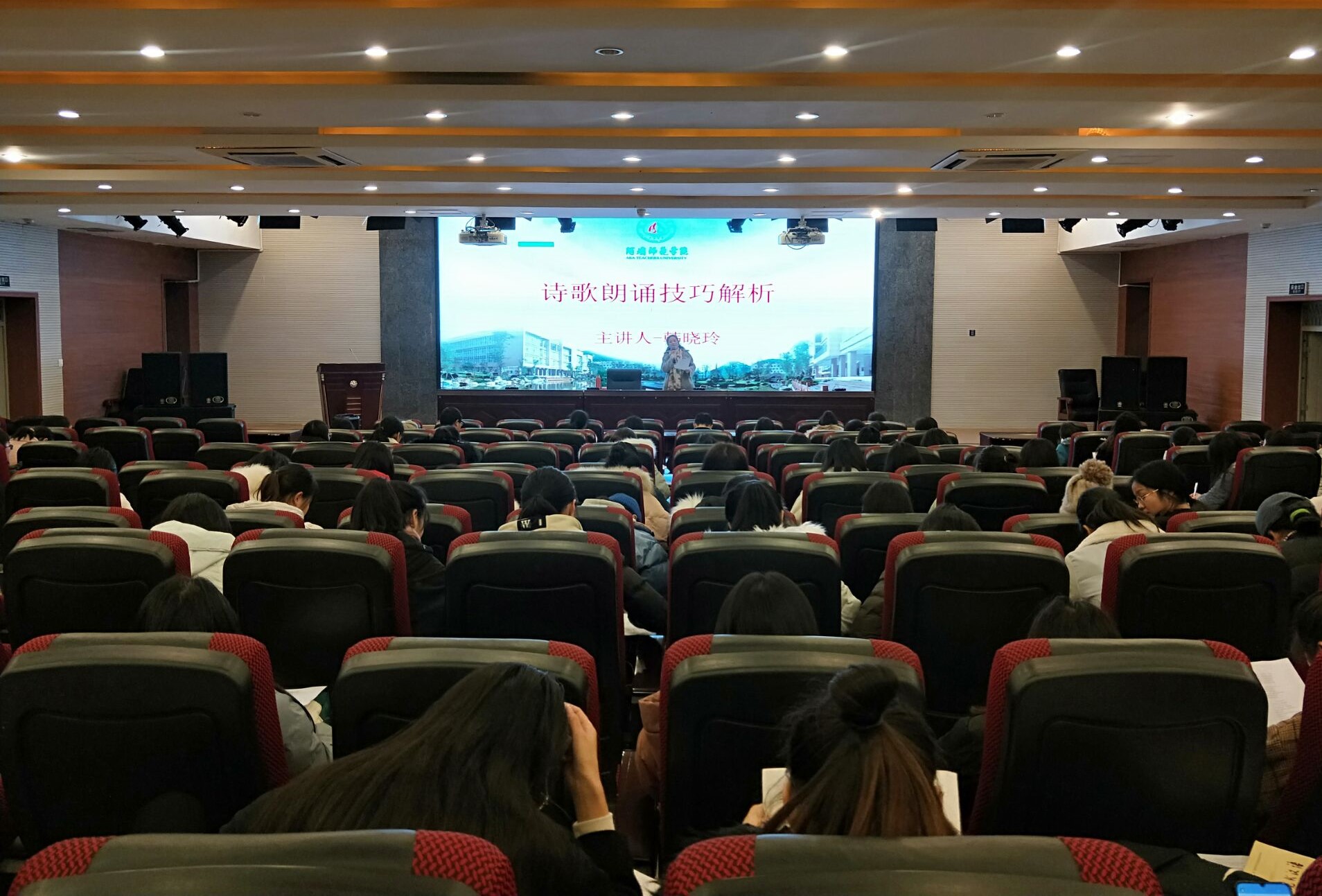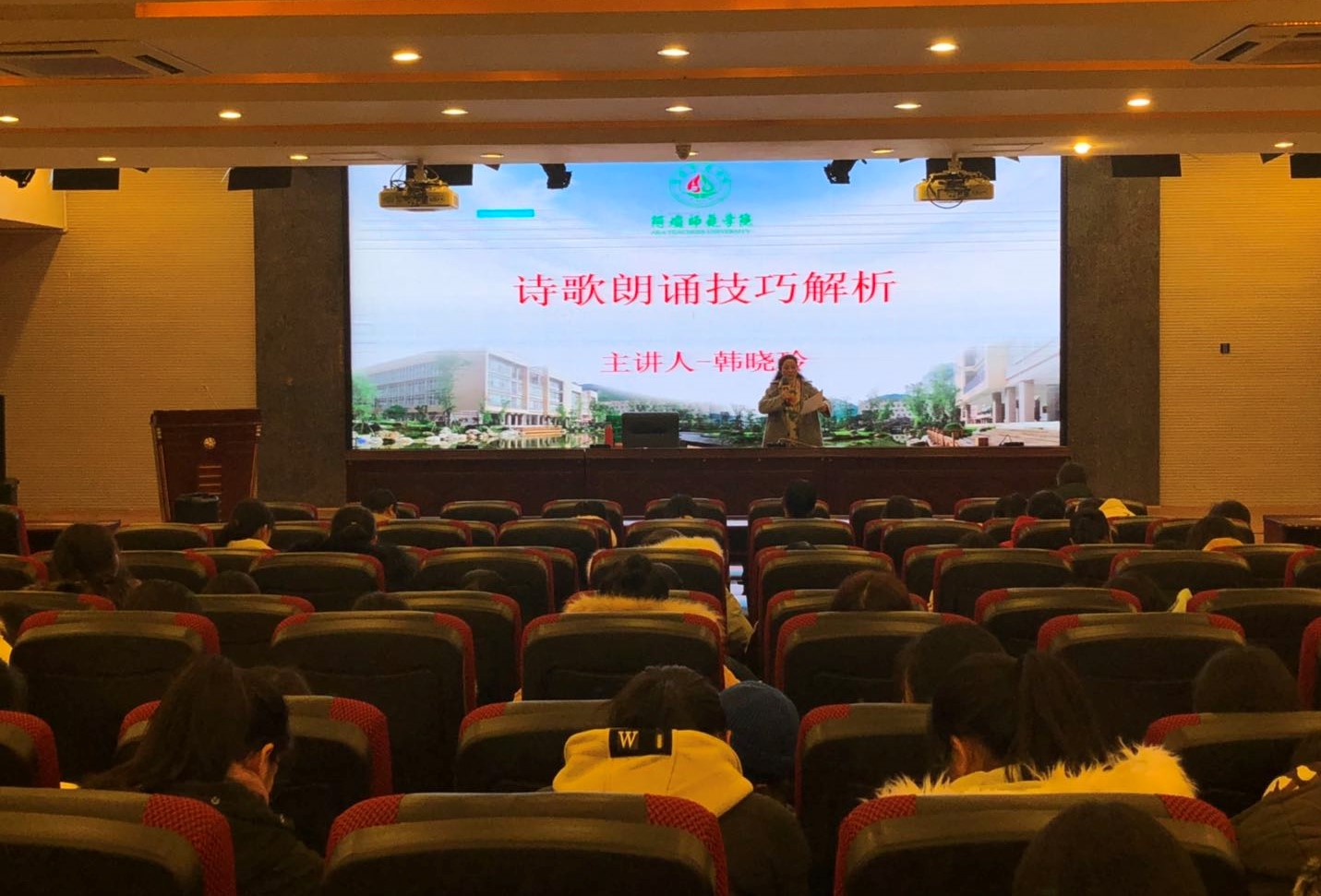 【本网讯】为提高我院学子的诗歌朗诵技巧,提升同学们的教师专业技能。2019年12月18日晚19时,国家级普通话测试员,新派朗诵创始人左旗老师的嫡传弟子韩晓玲老师莅临我校,于学术报告厅举办“诗歌朗诵技巧分析”的讲座。谭文旗副院长和我院部分学生参加了本次讲座,讲座由谭院长主持。