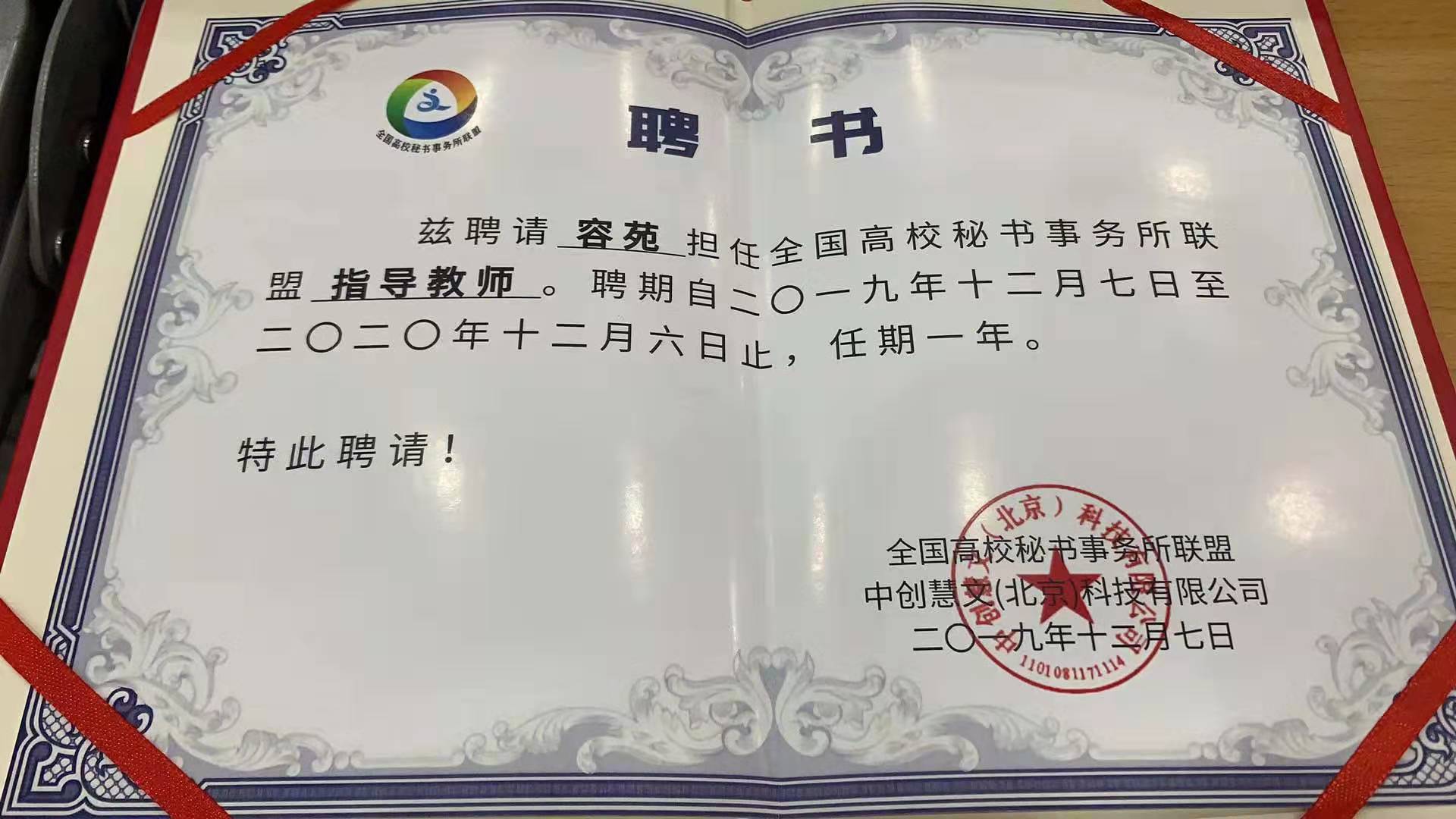 【图】我院容苑老师被聘为全国高校秘书事务所联盟指导老师