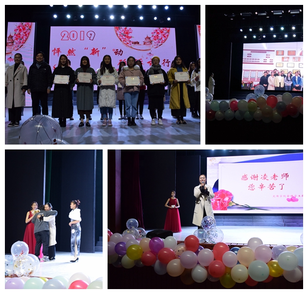 下一个环节,由凌小凤书记、谭文旗副院长上台为我院2017届团委学生会的学生干部们颁发荣誉证书,一张合影留下了这一精彩时刻。主持人挽留下台的凌书记,现场放映同学们的祝福视频。大屏幕上一张张青春又熟悉的脸庞闪现,曾受凌书记谆谆教诲的大家为她送出祝福。凌书记在同学们真诚的祝福中落下热泪,她讲到,她在阿师度过了三十七年并有幸能与我们相遇,今晚她非常感动和高兴,也希望我们把握好青春把握好每一天,做一个未来我们需要的、祖国需要的人才和栋梁。