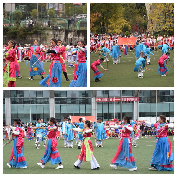 在庆祝中华人民共和国成立70周年的欢腾日子里,我校的锅庄比赛拉开了序幕,开场一首激情昂扬的《我和我的祖国》将舞蹈与浓厚的爱国情怀相结合。代表文学与传媒学院参加此次比赛的是2019级汉语言文学1.2班和藏本班两个班级共120名同学们。随着欢快的锅庄乐曲响起,足球场上绽开一朵朵色彩斑斓的花,我院的同学们和歌起舞,男生们动作夸张豪放,苍劲如雄鹰展翅于蓝天,雄健如奔马驰骋于草原;女生们动作舒缓绵延,柔美如凤凰飞舞,轻盈如弱柳拂水。那欢畅淋漓的舞姿、优美娴熟的动作,千般娇姿,万般变化,似孔雀开屏,似雪莲绽放,又似飞龙穿梭。微凉的秋风带动发丝舞蹈,片片鲜红的枫叶飘落,在这锅庄的秋日颂歌里,大家吟唱着同一旋律,踩着同一节拍,转出同一个圆圈。