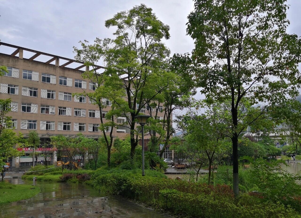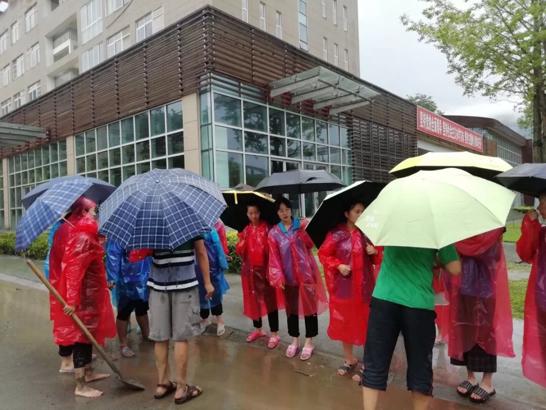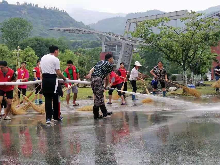 我校正坐落于受此次泥石流灾害影响的水磨镇,但因学校地势高,仅有校门口和行政楼两处进水,其余地方均没有受灾,受灾情况较轻。灾情发生后,学校领导第一时间召开紧急会议,启动应急方案,并组织在校的老师和同学对学校受灾区域进行巡检。向武校长、毛英副校长、罗清杨部长及部分留校的老师和同学参与了清淤工作。受泥沙冲刷的行政楼在大家的共同努力下变得和以前一样干净整洁,教学楼及实验楼内的设施保存完好,道路两旁的树木也巍然矗立,暴雨过后反而显得更加苍翠欲滴,一片生机盎然。