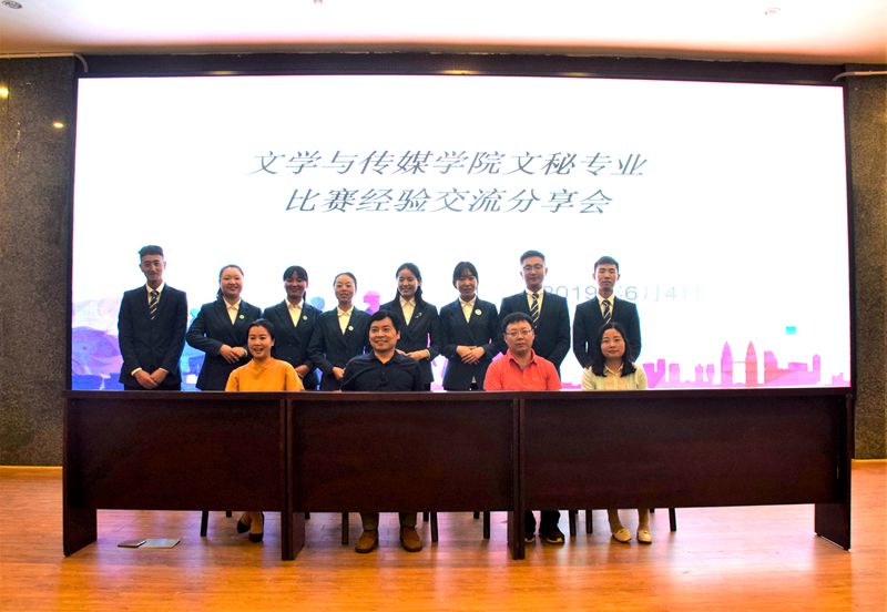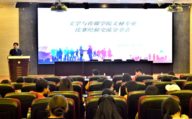 【本网讯】6月4日中午12点,“诚海•慧文杯”第九届全国商务秘书职业技能大赛赛后交流分享会在学术报告厅举行。我院副院长谭文旗、潘春霖老师、容苑老师、沈英英老师出席本次分享交流会,文秘专业全体在校学生到场聆听。