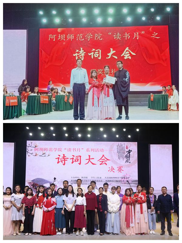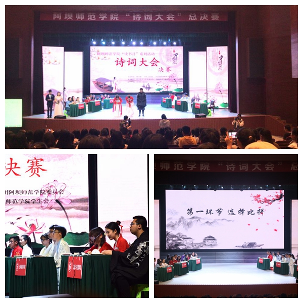 【本网讯】拂历史尘埃,现诗词华彩。中华诗词,奇妙无穷,中华文化,博大精深。5月22日晚7:30,阿坝师范学院“读书月”系列活动——诗词大会总决赛在南苑剧场举行。藏汉双语学院党总支书记周定真同志、数学与计算机科学学院党总支书记庄伯财同志、马克思主义学院党总支书记江先蓉副教授、图书馆馆长赵保华教授、学生工作部部长罗清扬莅临决赛现场。经过激烈角逐,共有6个学院入围此次决赛。