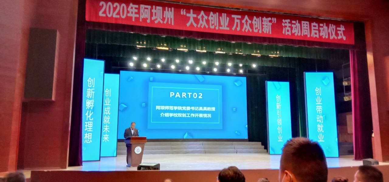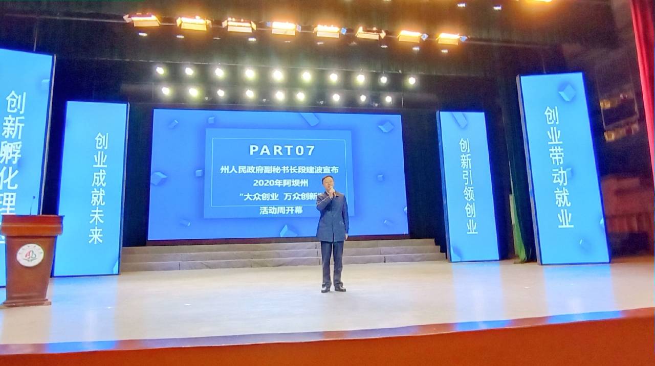 【本网讯】10月15日下午,由阿坝州人民政府主办,阿坝州科学技术局、阿坝州发展和改革委员会、阿坝师范学院承办的2020年阿坝州"大众创业,万众创新”活动周启动仪式在我校南苑剧场举行。阿坝州政府秘书长段建波、学校党委书记吴昊等出席。文学与传媒学院众多学生积极参与其中。