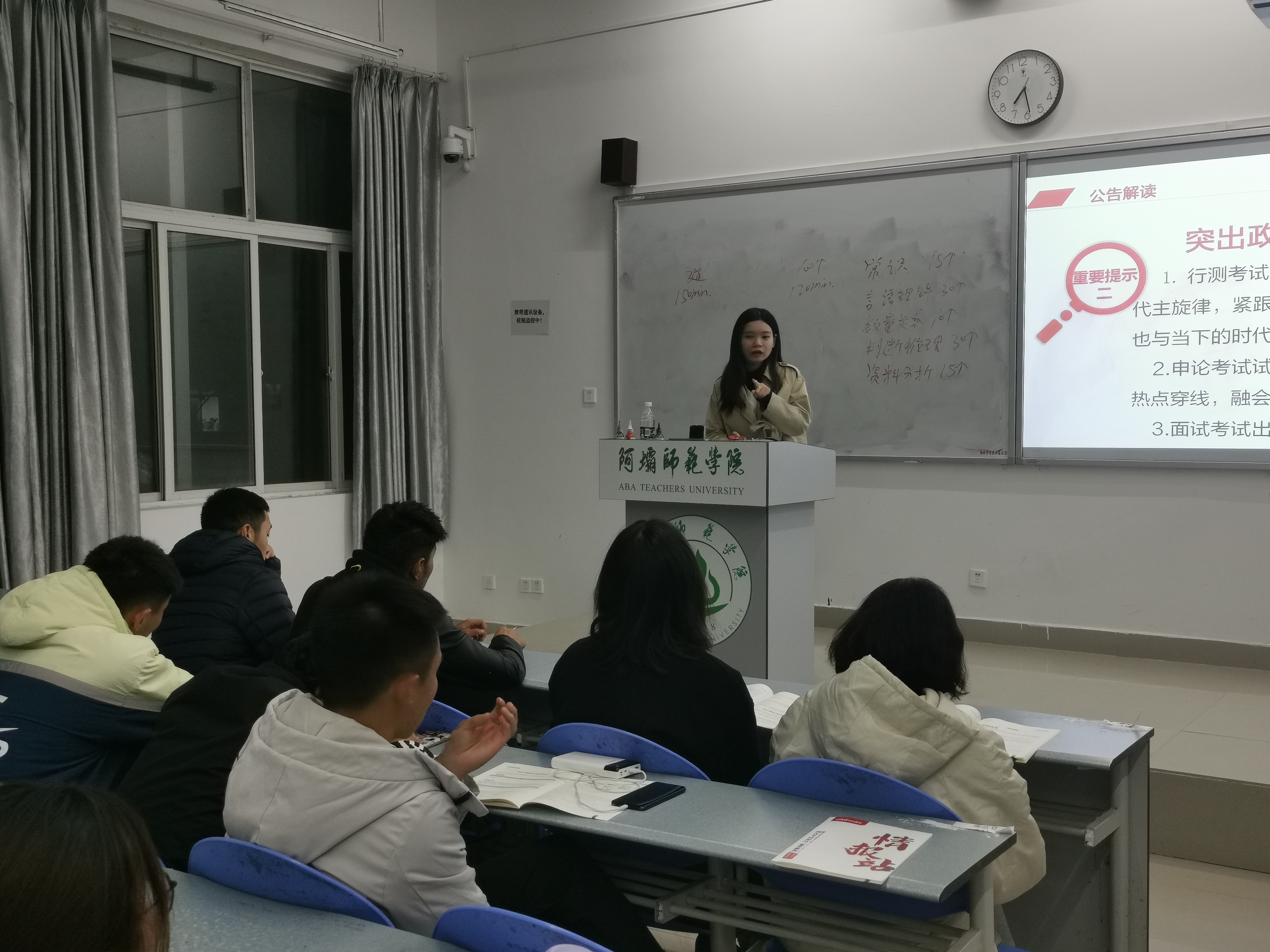 【本网讯】为了加深同学们对公务员考试的了解,提高备考水平,提升考试能力。2020年11月3日晚上19:00至21:00,文学与传媒学院毕业生在树人楼a301教室参加了由我校举办的“2020年下半年阿坝州招录民警公告解读”讲座。