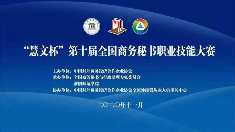 【本网讯】“慧文杯”第十届全国商务秘书职业技能大赛于2020年11月21—22日隆重举行(主赛场设在淮阴师范学院),来自全国18个省、市、自治区78所本专院校的140支参赛队伍、900余名师生相聚“线上”,同台竞技,共襄盛举。