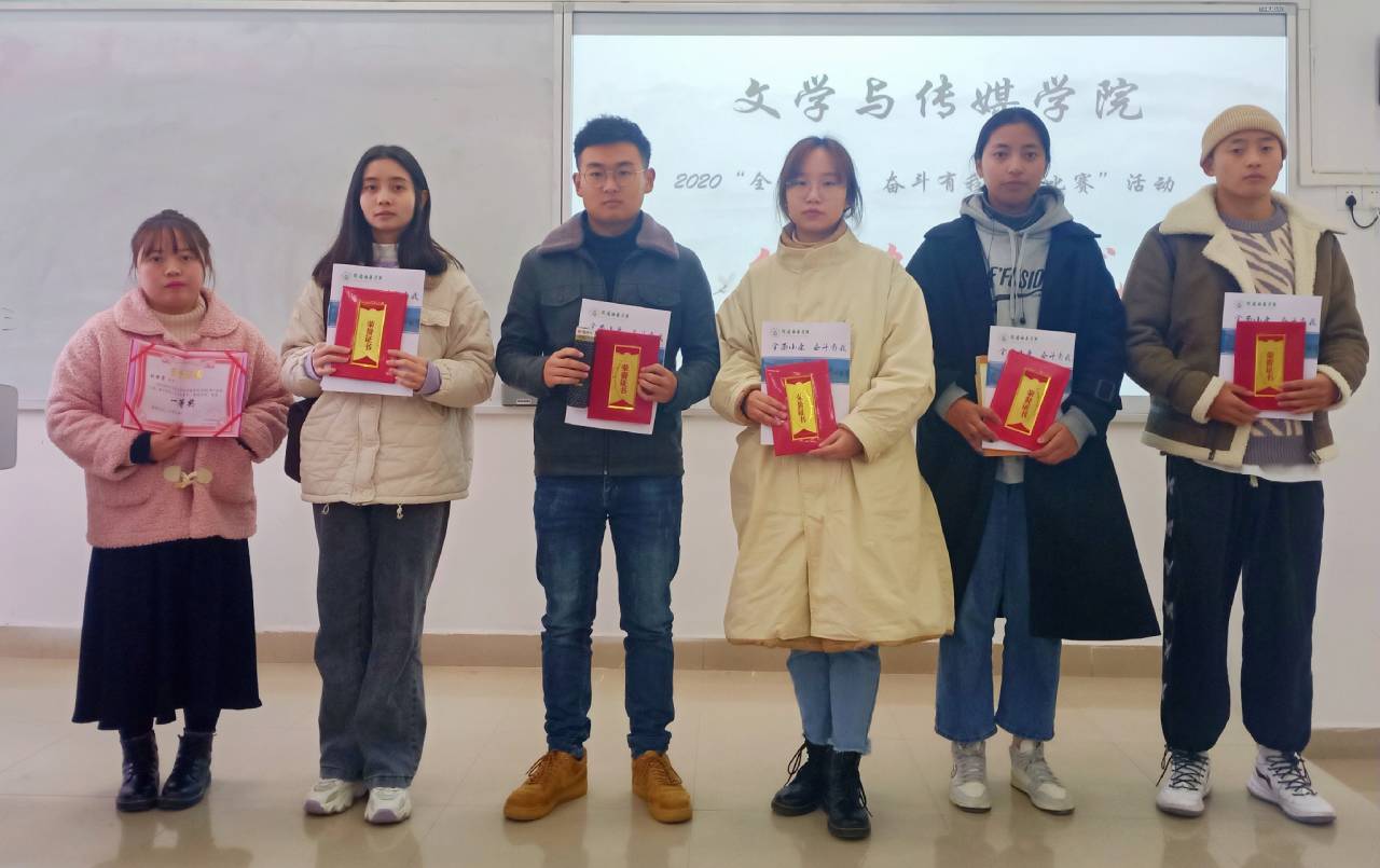 本次征文比赛活动的获奖者按时到达现场,接受这属于他们的荣誉。文学与传媒学院团委学生会副主席赵国强作为颁奖嘉宾,为各位获奖同学颁发获奖证书、礼品以及收录了所有获奖作品的《征文合集》,获奖同学们脸上都洋溢着笑容。2020年是不平凡的一年,是决胜全面建成小康社会、决战脱贫攻坚大功告成之年,相信同学们也能将作品当中展现出来的勇于担当、勇于开拓、共克时艰的精神,运用到今后的学习、生活和工作当中。