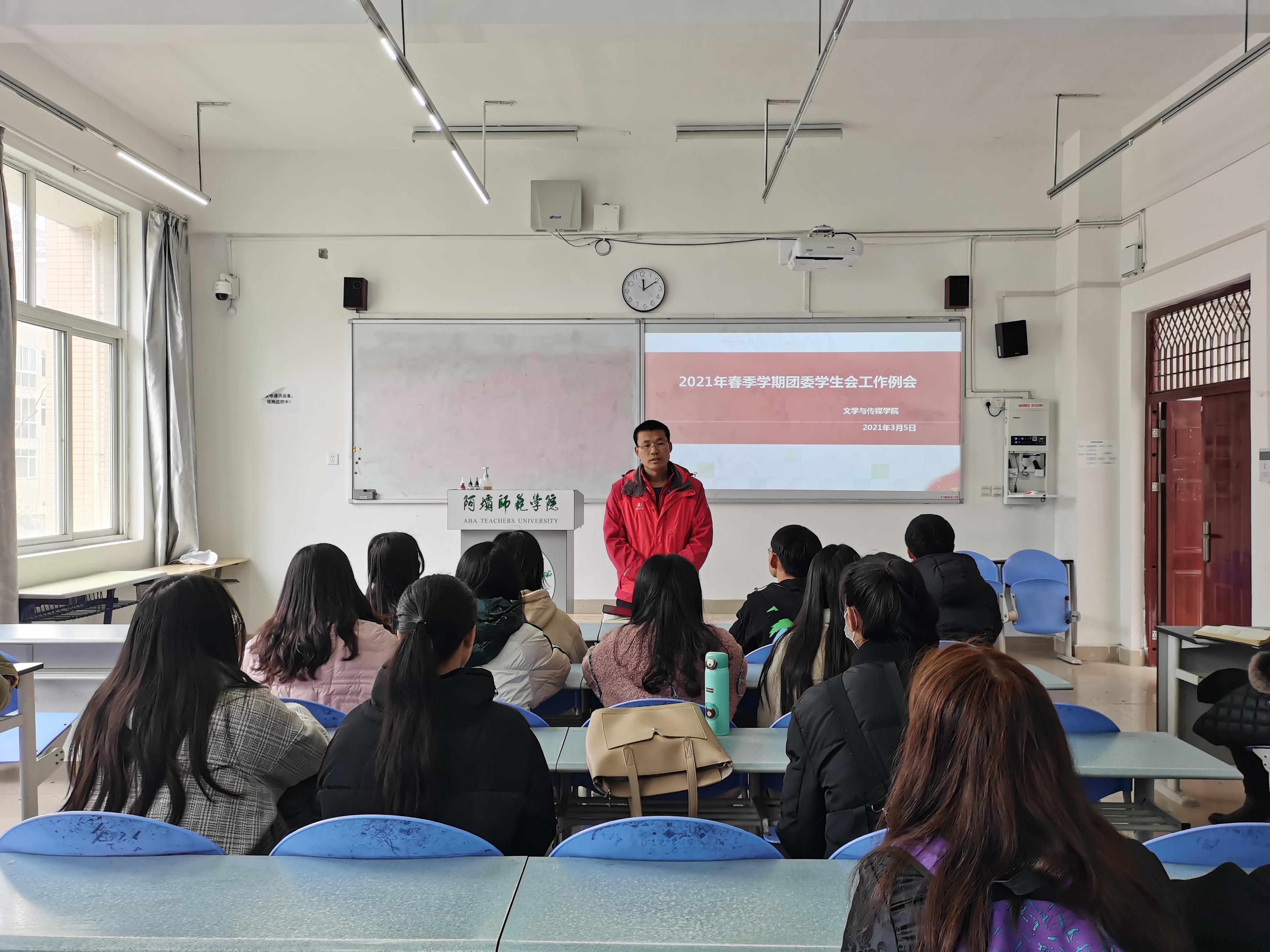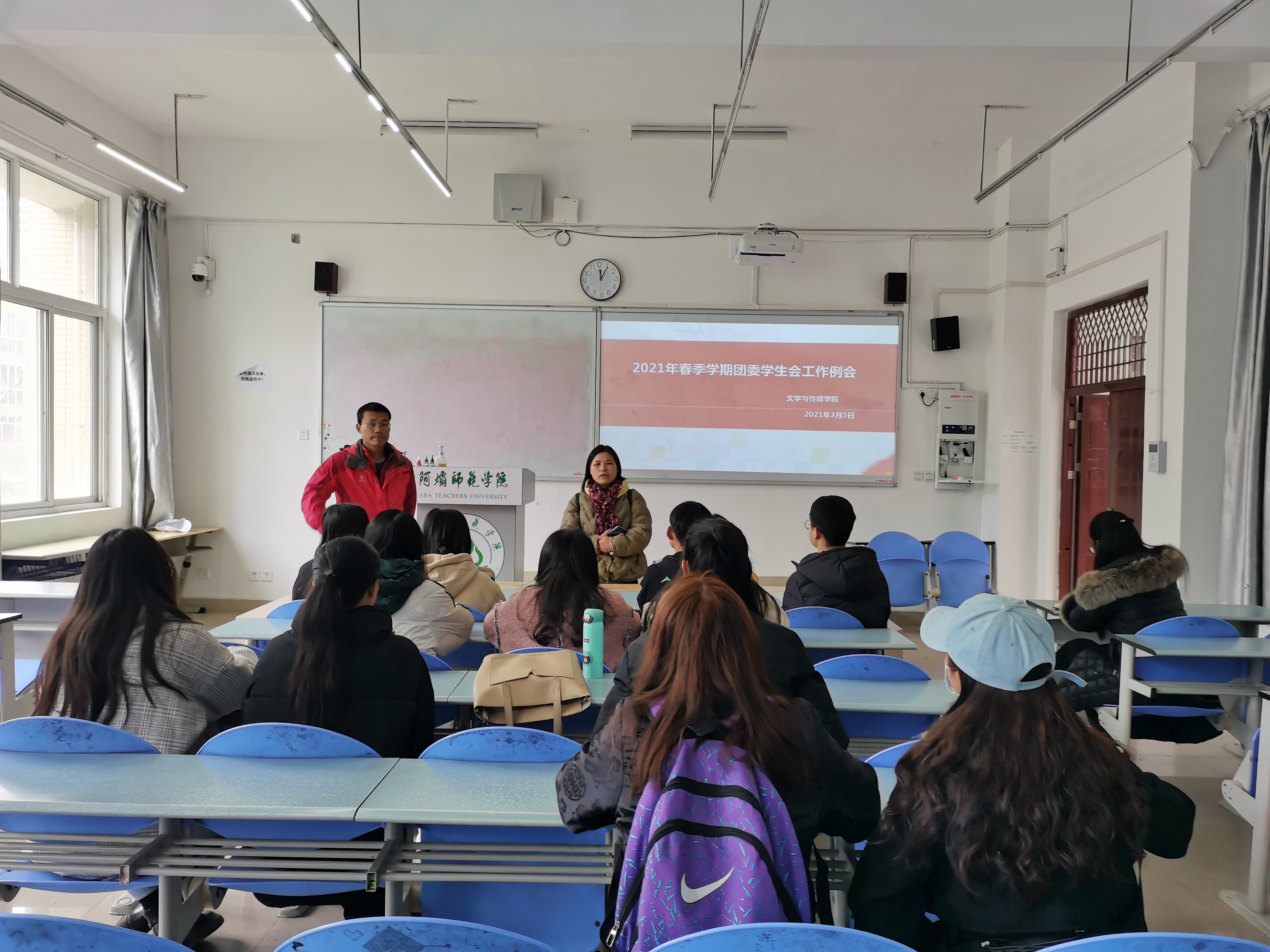 【本网讯】新学期,新气象。为了我院团委学生会能更好开展新学期的各项工作,我院团委学生会于2021年3月5日12:00在树人楼A203教室召开了新学期的第一次工作例会。本次例会由李伟伟老师主持,书记张晓英、辅导员费作芽出席,团委学生会主席团和各部门部长参与。