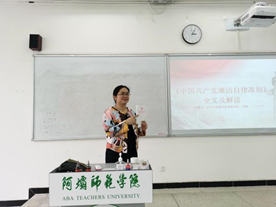 在讲课的过程中,田敏书记详细讲解了《中国共产党廉洁自律准则》的具体内容,列举了许多真实的例子让发展对象充分认识到遵守中国共产党廉洁自律准则的重要性,并结合发展对象的自身实际,教导他们如何与学习生活相结合,在实践中践行廉洁自律。在党课最后,田敏书记讲到,希望发展对象们能够认真学习党的理论知识,积极发挥党员的先锋模范作用,始终以一个党员的标准来严格要求自己,早日成为一名合格的党员。