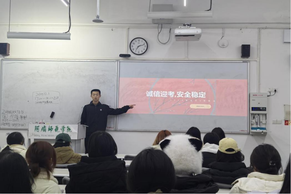 此次主题班会由各班班长主持。班长带领全班学习了《阿坝师范学院关于印发学生考试违纪及作弊处分办法(修订)的通知》文件,总结了学校有关考试纪律的相关规定,并给出考试违纪的具体案例,指出诚信应考的重要性。