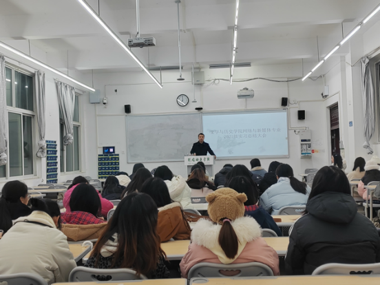 【本网讯】为让2021级学生回顾实习过程中的经历,总结成功经验和存在的不足,为今后的学习和工作提供借鉴,并与2022级学生交流实习心得,分享在实习过程中的所见、所闻、所感,促进知识和经验的共享。在王钎江老师的组织下,2021级网络与新媒体班级和2022级网络与新媒体班级于2024年12月29日晚上7时在树人楼A202召开实习总结大会,办公室主任王钎江老师、辅导员李婷老师参与了此次大会。