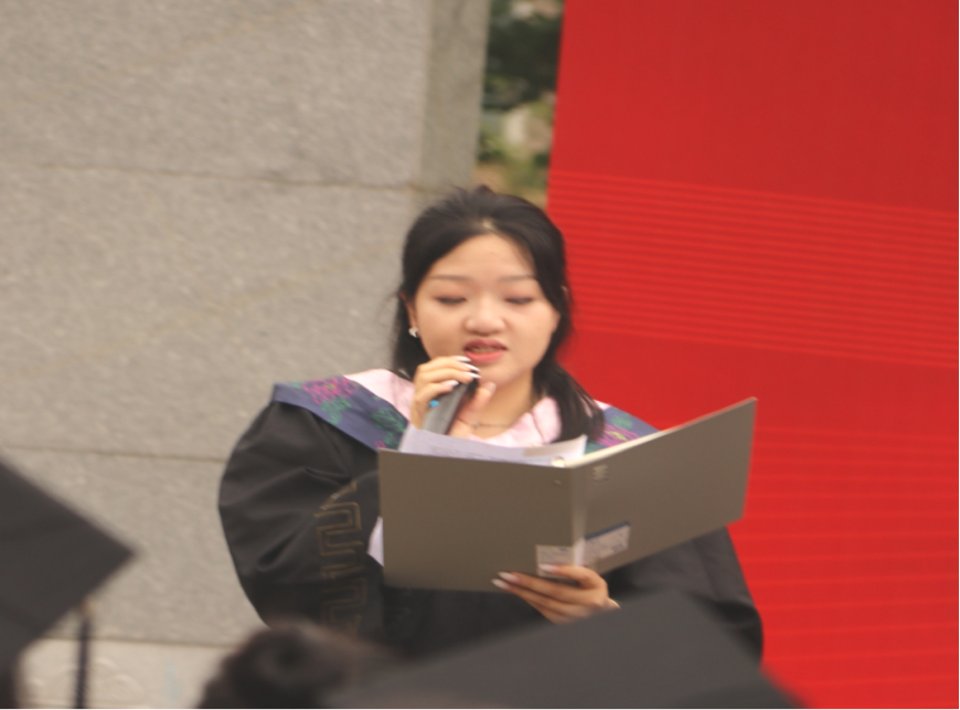 紧接着,学生代表杨娟发言。她深情回顾了四年大学生活,感谢学院提供的优质学习环境和老师们的悉心教导。她表示,将带着母校的期望和师长的嘱托,在新的征程上砥砺前行。