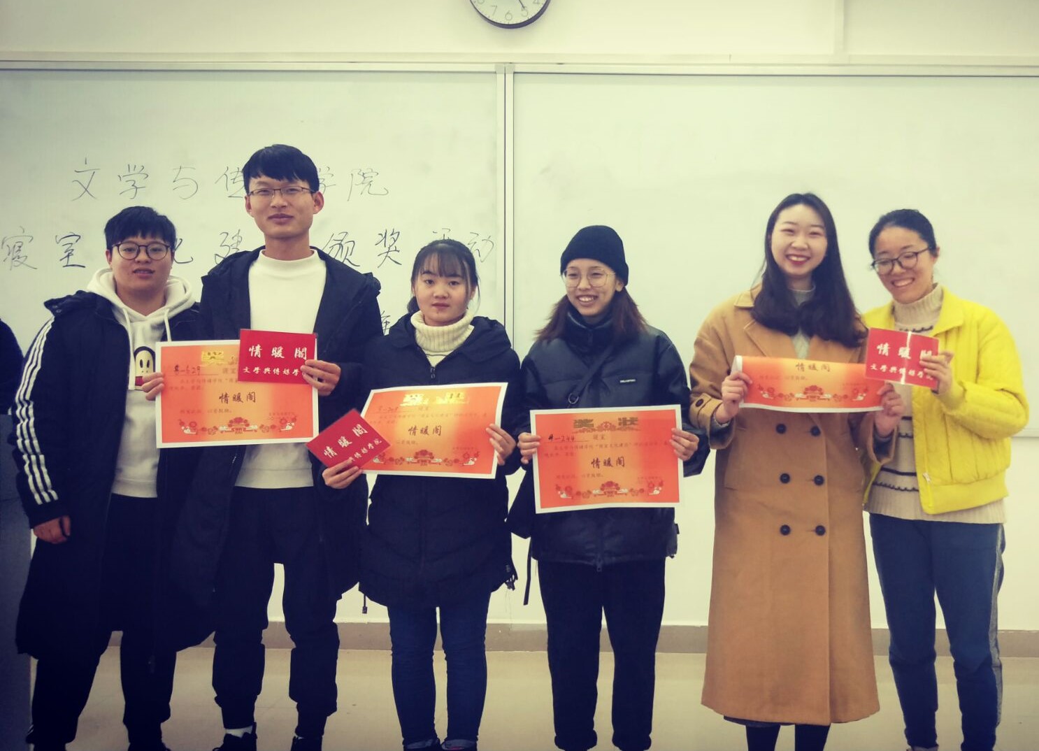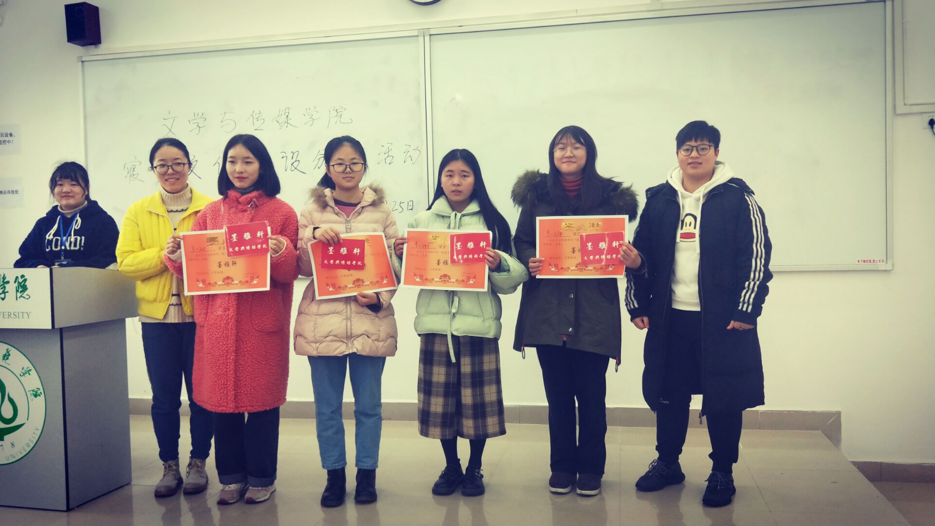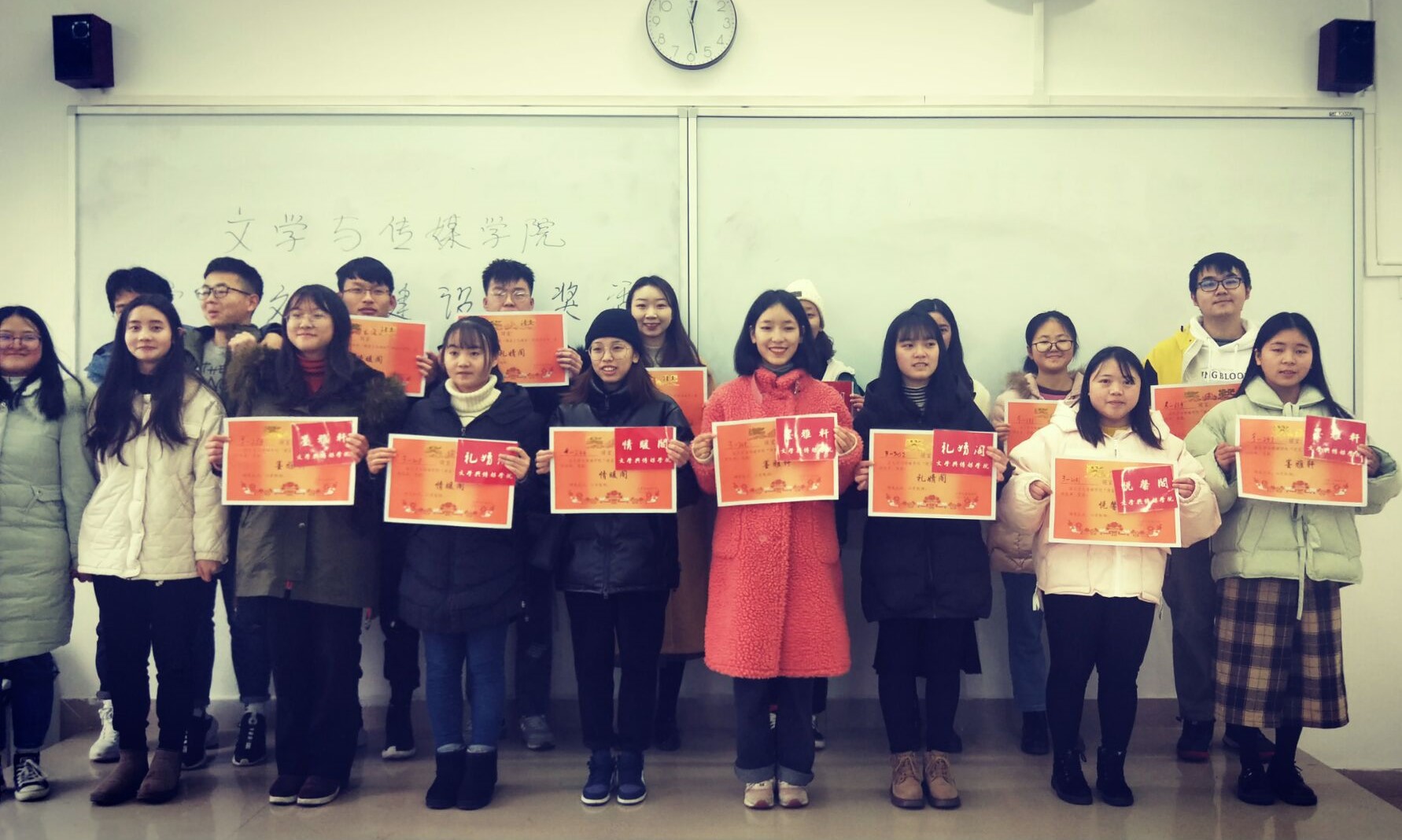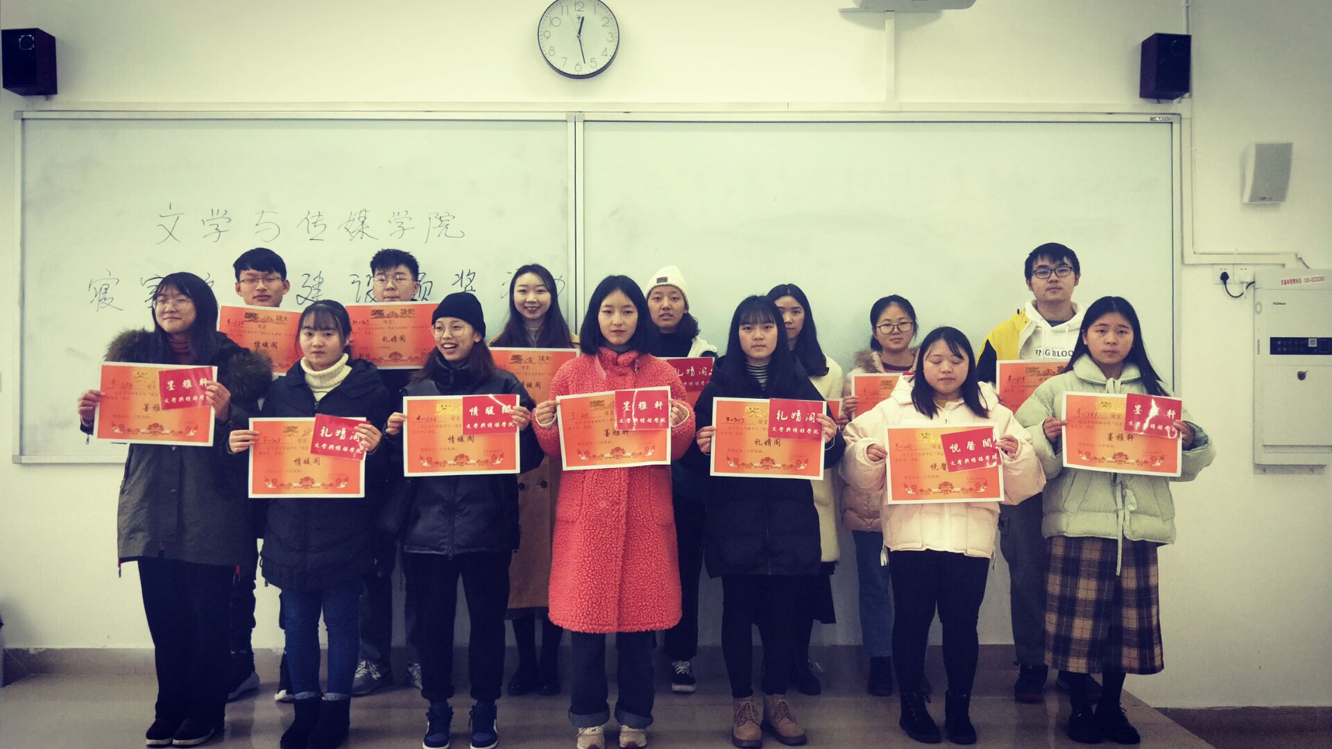 【本网讯】为丰富校园文化生活,营造美好和谐的宿舍文化氛围,我院特举办寝室文明大赛。根据《文学与传媒学院寝室文化建设活动策划》文件精神及相关评选标准,经本学院老师和团委学生会纪检部工作人员的讨论,最终评选出了16个优秀文明寝室。12月25日中午12时20分,于树人楼A202举行了文明寝室颁奖仪式,我院程远蝶老师和团委学生会主席郭子溢担任颁奖嘉宾。