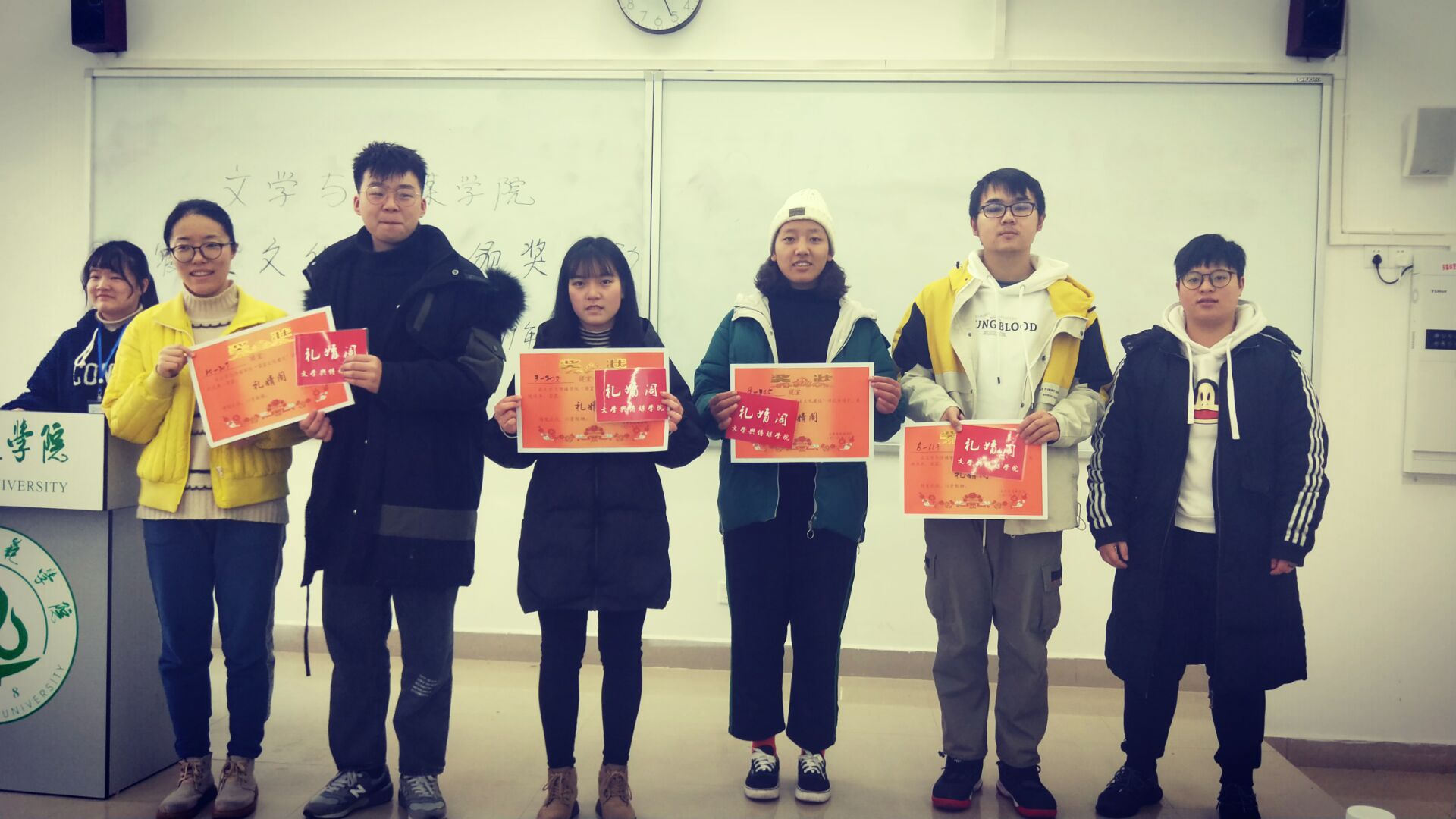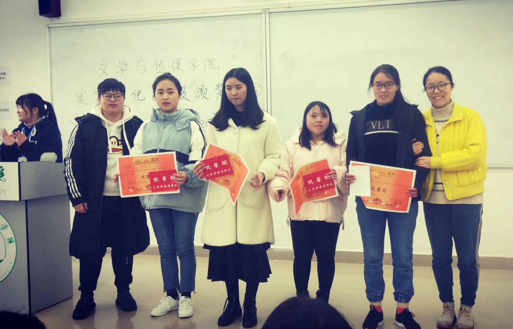 十六个优秀寝室,多种装饰风格,打造的是整洁美观的宿舍,传递的是舍友之间的温暖情意,营造的是温馨舒适的学习、生活环境。此次活动为16个优秀寝室授予了四种称号:“悦馨阁”,寝室装饰风格温馨怡人;“墨雅轩”,寝室成员的书法作品美观有风骨;“情暖阁”,为参与志愿者、献血等公益活动最多的寝室;“礼婧阁”,则为寝室干净整洁、总体美观。主持人公布完获奖名单后,颁奖嘉宾为获奖寝室颁发奖状和奖品,并与他们合影留恋。