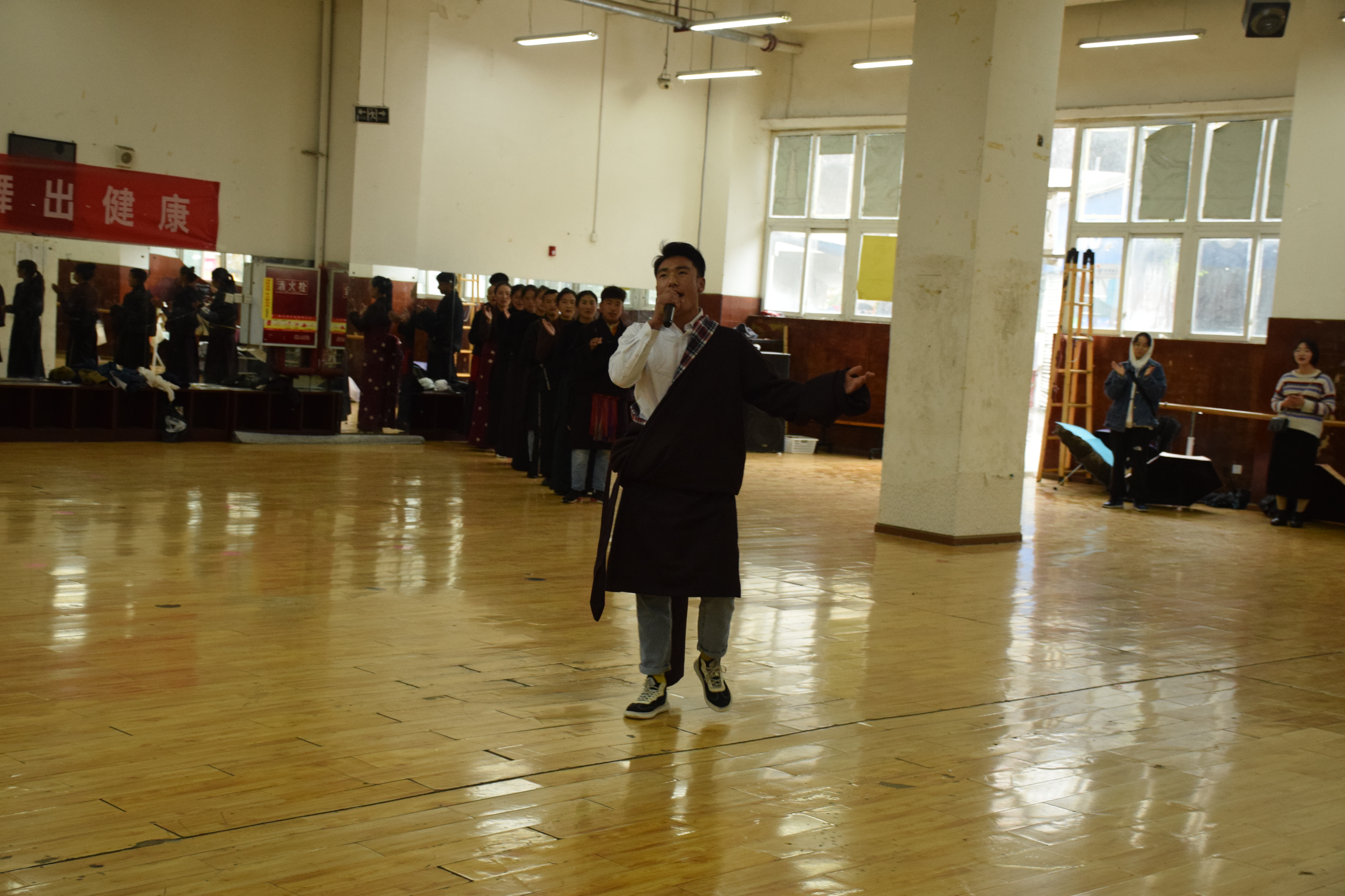 参加本次比赛的分别是2019级汉语言文学一班,二班和藏本班三个班级代表队。在主持人简单介绍规则和评分标准之后,比赛正式拉开序幕。高昂优美的歌声缓缓入耳,一位藏本班的同学用他动听的声音,将大家带入了他们的表演。悠扬的音乐响起,藏本班的同学们踏着欢乐的舞步,慢慢进入大家的视野。他们随着欢快的旋律,合着动感的节拍,男生豪放如奔驰的骏马,女生柔美若天山的雪莲,一举一动彰显藏族风情。