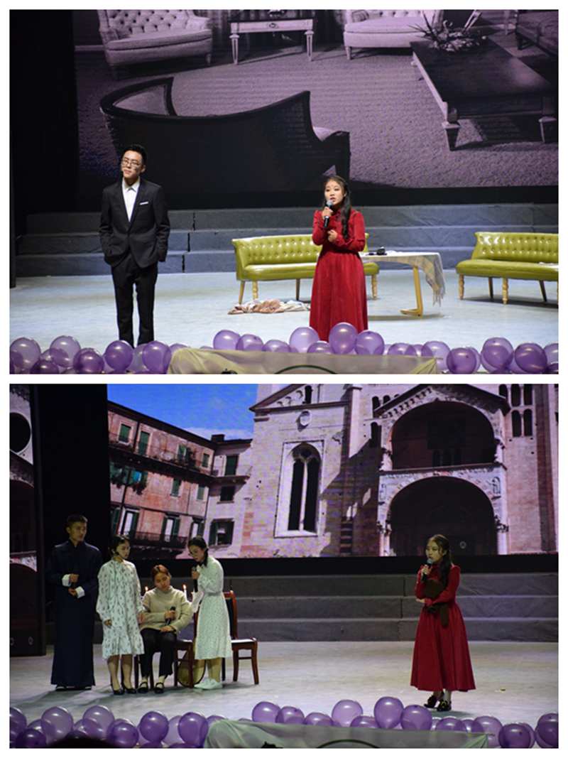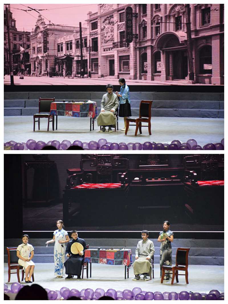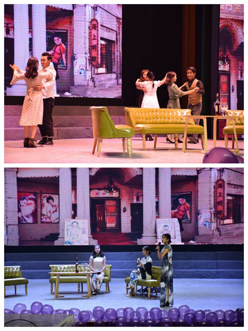 表演伊始,由主持人为在场学生介绍莅临本次话剧演出的老师,然后宣布话剧正式开始。随后,舞台幕布缓缓拉开,令人期待已久的《倾城之恋》正式上演。舞台上,白家孙女金蝉黏着父亲白家四爷流露着学舞的心思,而后四姨太等人上场,胡琴咿咿呀呀地拉着,三两女人或沏茶、或按摩、或刺绣,昏黄的灯光下,浮生百态正恣意上演着。经历了一次失败婚姻的白家小姐白流苏,正受着亲戚间的冷嘲热讽,刹那间,她猛然跪地,在内心深处已然受够了自己命运的她,想要有所挣扎。
