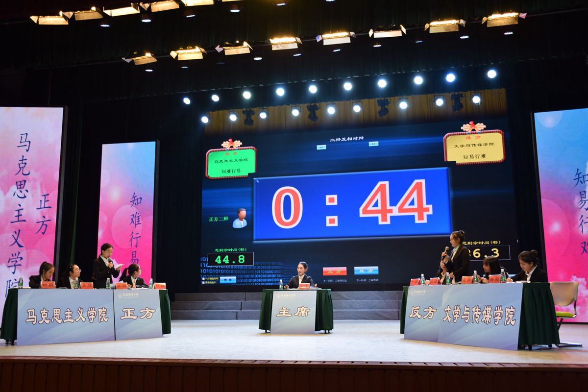 本次辩论赛共分为两场,第一场是音乐舞蹈学院与数学与计算机科学学院的季殿军争夺战,第二场是马克思主义学院与我院的冠亚军争夺战。在冠亚军争夺战中,马克思主义学院作为正方,我院作为反方,就“知难行易”和“知易行难”为辩题展开辩论。在立论阶段,正方一辩先声夺人,犀利地指出“知难行易”,并以明确的观点、清晰的逻辑、自信的姿态赢得阵阵掌声。随后反方一辩不甘示弱,运用理论依据进行破题立论并列举大量针对性事例强调我方观点“知易行难”。在随后的攻辩环节中,面对对方辩手的激烈询问,我方辩手毫不逊色的驳回了对方的反问,并再次列举一系列例子对我方辩题进行佐证。双方争锋相对、步步紧逼,现场气氛迅速升温,达到白热化阶段。在自由辩论环节,双方引经据典并紧密协作,仔细寻找对方辩友的思维漏洞,唇枪舌战将辩论赛推向高潮。最终我院以敏捷的思维、良好的风貌、出色的口才荣获冠军,马克思主义学院正方三辩陈敏同学凭借流利辩词以及从容应对挑战的态度,获得“最佳辩手”称号。
