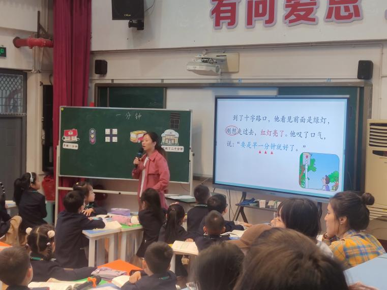 第二节课是侯霁凌老师的《一分钟》,侯老师紧扣主题“时间”,首先让同学们在规定的“一分钟”内接龙读出词语,然后以问题“元元为什么会迟到?”导入课程,让同学们找出元元上学路线与出现了什么状况,每个失误的一分钟导致元元最后迟到了二十分钟,可见一分钟的重要性,教育学生应当学会“珍惜时间”。