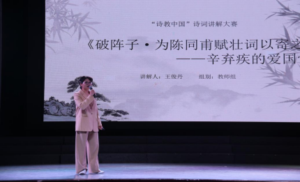 在“诗教中国”的舞台上,选手们从诗词的作者生平、内容解读、情感表达以及艺术手法等多个维度,深入挖掘并呈现了诗词的独特魅力。教师组的王俊丹老师慷慨激昂地为我们带来辛弃疾的《破阵子·为陈同甫赋壮词以寄之》。她声情并茂的演绎,使我们仿佛置身于辛弃疾那个时代,深切感受到他忠诚不二、爱国爱民的赤诚之心以及壮志难酬、英雄迟暮的悲愤之情。