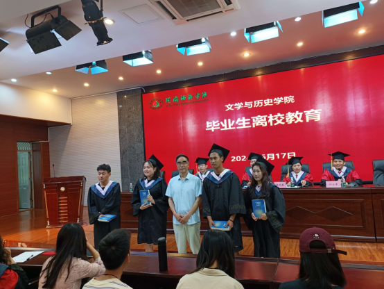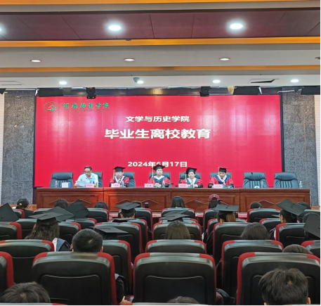【本讯网】2024年6月17日,文学与历史学院在学术报告厅开展了“铭恩.启航”为主题的“2024届学生毕业典礼暨学位授予仪式”,学院全体教职工及毕业生参加了此次会议。文学与历史学院关心下一代工作委员会,特邀请阿坝师范学院校级督导员、学院退休老教授申向阳老师对2024届毕业生进行离校教育,为毕业生的成长成才提出建议与寄语。