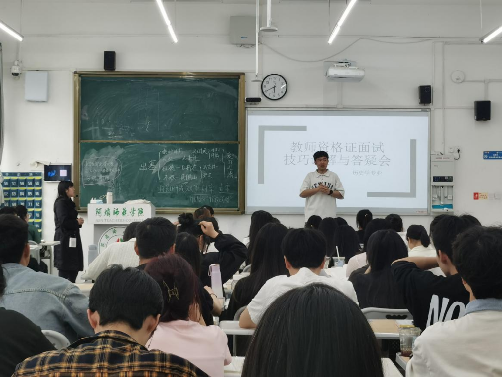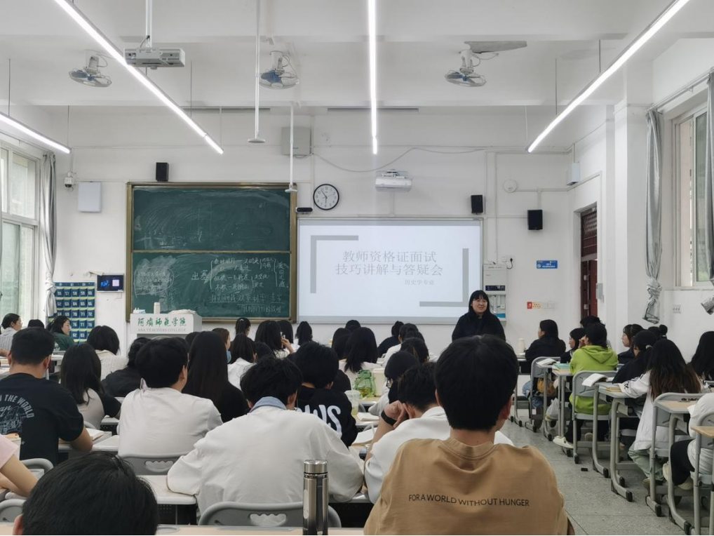 【本网讯】为助力学生掌握教师资格证面试要点,提升备考实效,文学与历史学院历史学专业于2025年5月14日在树人楼B303召开“教师资格证面试技巧讲解与答疑会”。会议邀请通过面试的学生代表蔡丛明同学、专业教师何舒颜老师现场分享经验,近70名备考学生参与学习。