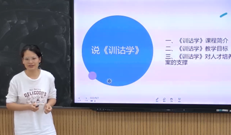 青年教师王俊丹从课程简介、教学目标、毕业支撑度三个方面介绍了“训诂学”课程。“训诂学”课程前启“古代汉语”“中国古代文学”,后承“文献学”。虽然是一门选修课,但在培养学生文言文阅读能力、古书古注使用能力方面具有重要作用。