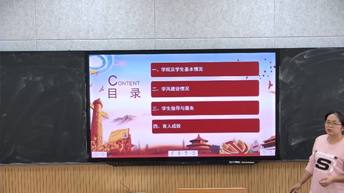 首先,学院党委书记田敏高屋建瓴,从党的教育方针入手,强调坚持教育为社会主义现代化建设服务,并从“学院及学生基本情况”“学风建设情况”“学生指导与服务”“育人成效”“存在不足及改进措施”五个维度,对学院目前的整体情况进行梳理,并针对存在的问题提出建设性意见。通过书记的报告,学院教师对学院学生的情况有了更全面的认识,并在今后的工作中更加明确育人方向,细化育人措施。