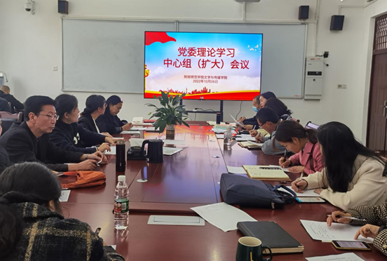 【本网讯】2022年10月26日,文学与传媒学院在树人楼B205会议室召开了党委理论学习中心组(扩大)学习会议。会议就党的二十大报告、《我国碳达峰碳中和战略及路径》及我校本科教学工作合格评估的相关知识等方面展开了学习,会议由学院党委书记田敏主持,学院党委副书记、副院长张晓英,副院长叶小军出席会议,学院全体教师参加了此次会议。