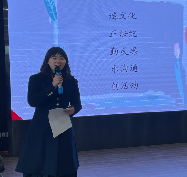刘悦老师围绕班级德育建设这一主题,从“造文化”“正法纪”“勤反思”“乐沟通”“创活动”等五个方面给大家进行了详细地分享。