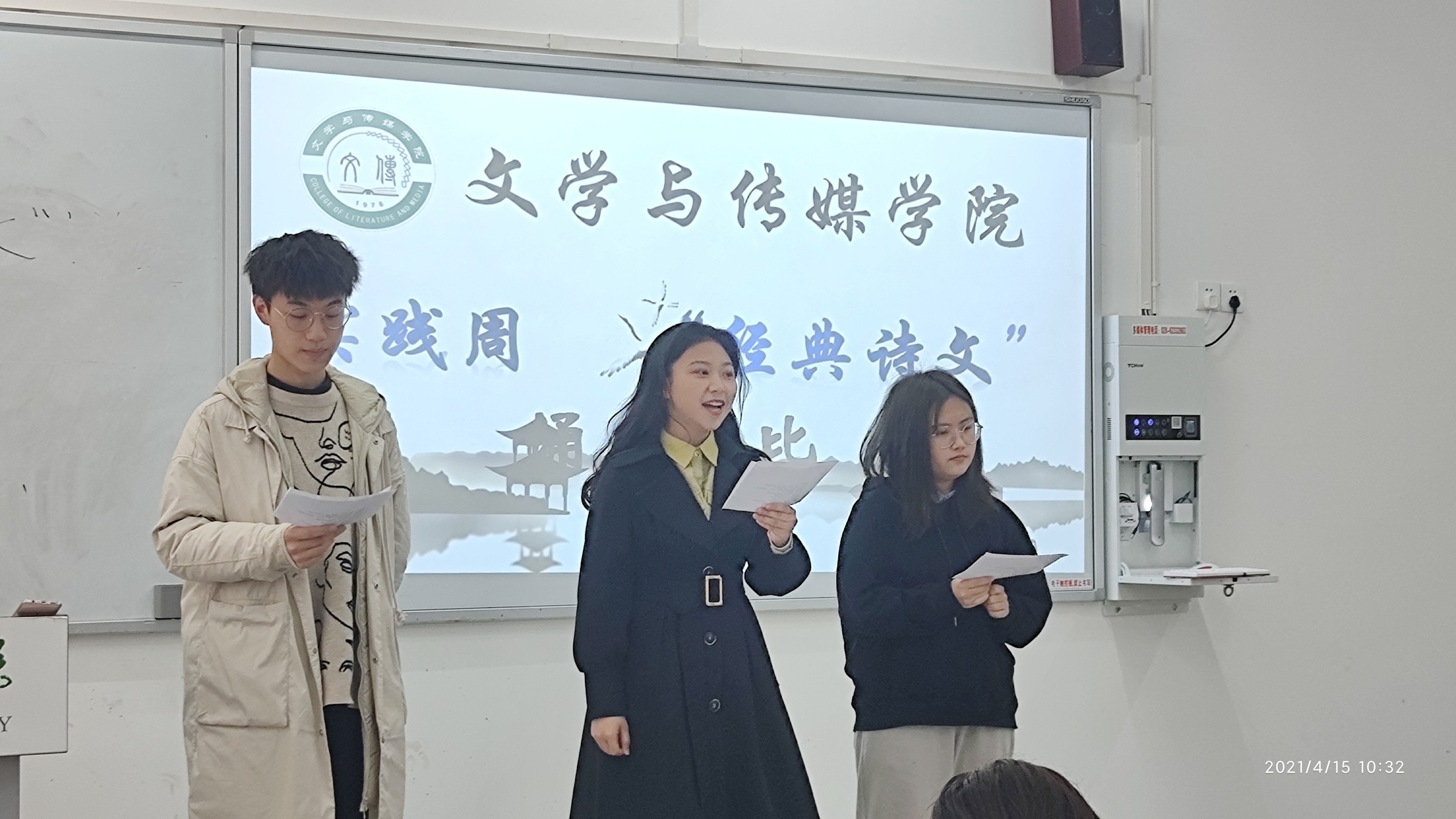 【本网讯】为充实文学与传媒学院2021年春期第7周教学实践周教育教学活动,同时培养学生朗诵能力,扎实教师教育“听说读写”基本功。我院于2021年4月15日上午10:00准时在实验楼C栋102举办朗诵比赛。