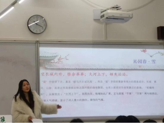 我班的七个小组分别上台讲课。一组格桑哈姆巧妙设题引入本次课堂,语言亲切幽默,带同学们走入好地方葡萄沟;二组刘庆授讲《采薇》时,语言情感饱满,以战士们离乡出征的乡愁开始,以《乡愁》作结,教学设计结构完整;三组张月优美的ppt,结合讲课,为大家带来毛泽东的《沁园春·雪》;四组刘久梅的课堂如课文《秋天的雨》本身一样生动活泼可爱,引人入胜;五组沙马次共课堂互动很好,教学目的明确,向同学们展示了《暮江吟》里一幅夕阳西沉的暮色美景;六组刘莉《忆秦娥·娄山关》备课极其充分,教态自然而讲课有道,层次感强;七组徐川平对《山行》的重难点解析清楚,课堂管控很好,同时留下给同学们独立思考的空间。