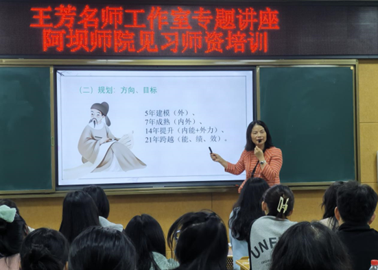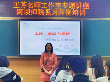 【本网讯】为提升学生师范技能,增进学生职业规划能力,2022年10月18日下午,阿坝师范学院文学与传媒学院2021级汉语言文学1班赴李冰中学教学实践团队邀请该校教学名师王芳开展了以“选择、规划和坚持”为主题的专题讲座,并围绕讲座内容展开了讨论与学习分享。讲座在李冰中学实验楼录播室召开,带队老师高璐、张艳、熊刚及2021级汉语言文学1班全体同学参加了此次专题讲座。