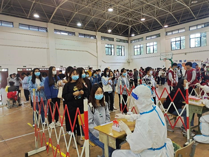课后,同学们在体育馆进行核酸检测,为明日的学习做好准备。