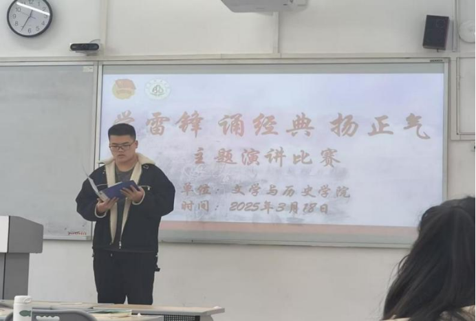【本网讯】为弘扬雷锋精神,激发大家学习雷锋、奉献社会的热情,文学与历史学院于2025年3月18日在树人楼A202举行了雷锋月主题诵读活动。本次大赛共有29名参赛人员,赵鑫、李乐乐作为大赛负责人组织和主持活动,文学与历史学院青年教师卢晓倩和高晓君担任大赛的评委。