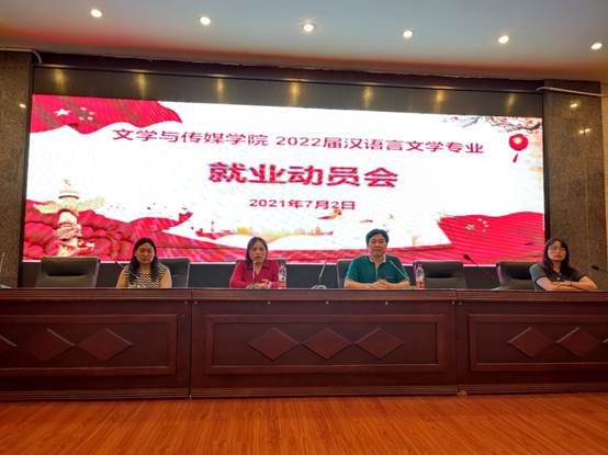 【本网讯】7月2日下午1:30,文学与传媒学院2020届汉语言文学专业就业动员会在学习学术厅举行,文学与传媒学院党总支副书记张晓英教授、文学与传媒学院副院长谭文旗教授、文学与传媒学院学生管理办公室主任李伟伟老师出席此次会议,2018级汉语言文学专业班班主任、辅导员到场参会。会议由李伟伟老师主持,2018级全体学生参加。