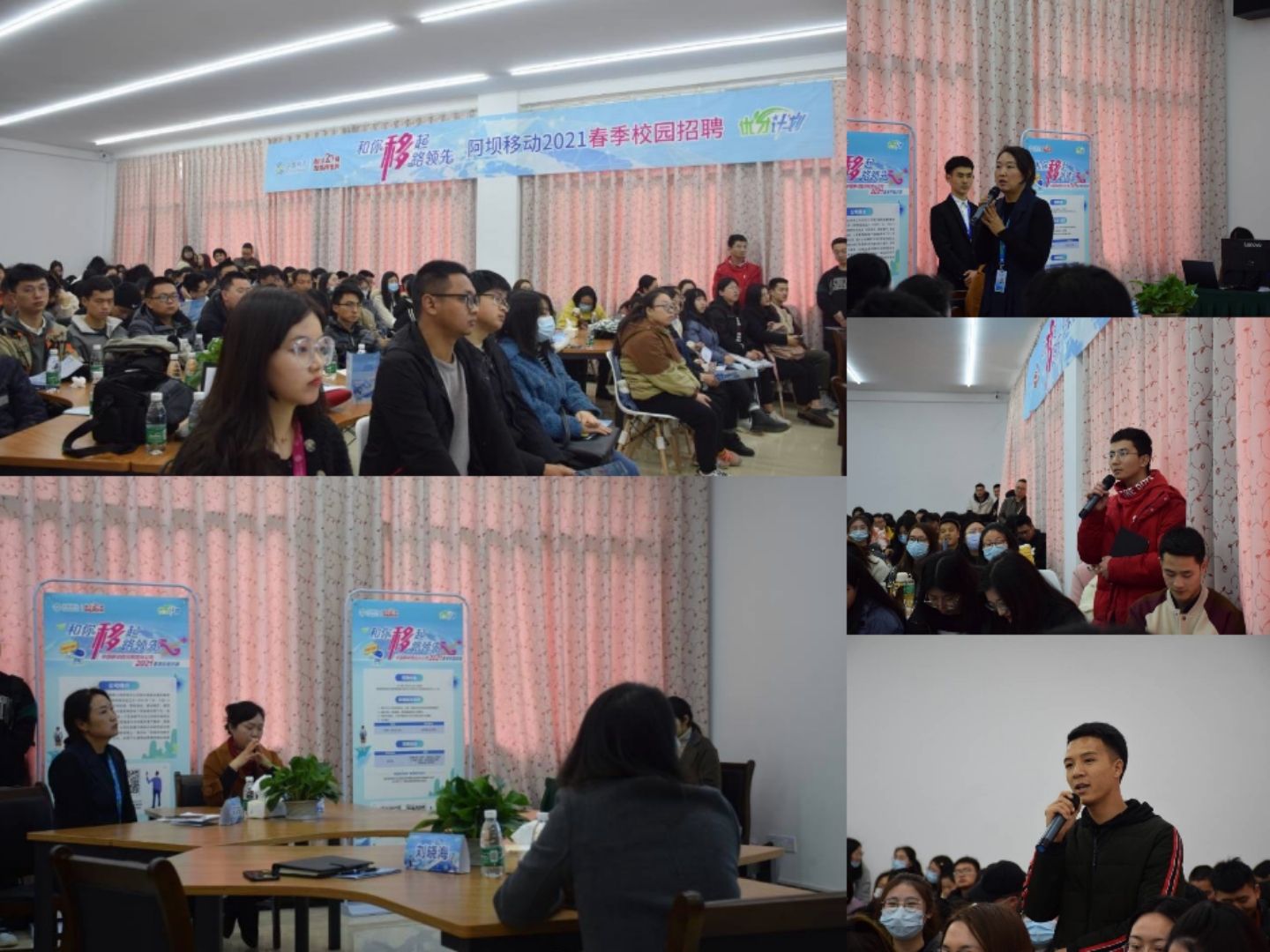 【本网讯】为拓宽阿坝师范学院2021届毕业生就业渠道,提高应届毕业生就业机率,我校联合中国移动通信集团有限公司3月10日14:00在树人楼B104举行了专场活动,文学与传媒学院应届毕业生积极参与了此次专场活动。