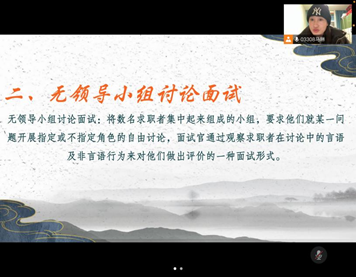 培训开始,马琳首先简单重温了上次培训的面试技巧内容,其次,重点讲解了面试的第二种类型——无领导小组讨论面试。在讲解过程中,马琳列举了常见题型并通过案例来进行一一讲解,涉及角色特点与技巧等多个方面。