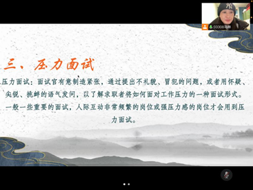 而后,马琳又讲解了第三种面试类型——压力面试,提到压力面试的考点有情绪控制力、抗压力、应变能力以及压力面试的形式、应对技巧等。