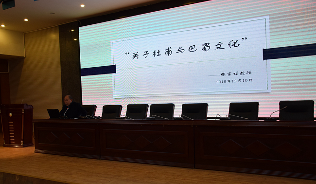 【本网讯】为提升我院学生文学素养,加深学生对杜甫诗词的理解。12月10日晚7:30,民研所所长张宗福教授莅临我院,于学术报告厅开展“杜甫与巴蜀文化”专题讲座。参加此次讲座的有我院2017级、2018级本科学生。讲座由我院副院长谭文旗教授主持。
