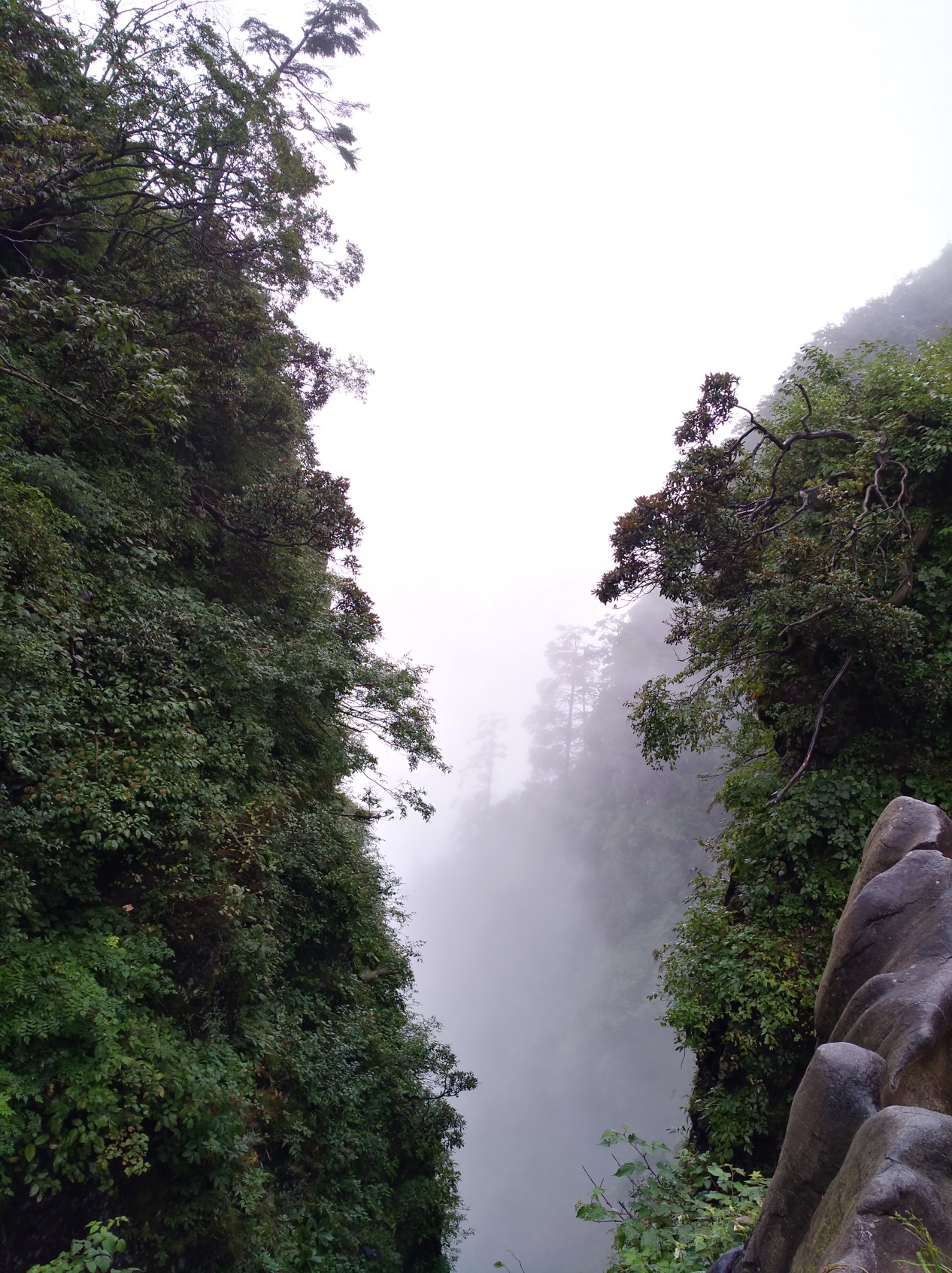 抵达金顶已是午后,十方普贤金装佛像端坐眼前,却令人十分平静,仿若山顶之上的一处避风港,使人心静如水。舍身崖外,一片白色,就算是“山色空濛雨亦奇”也形容不尽。