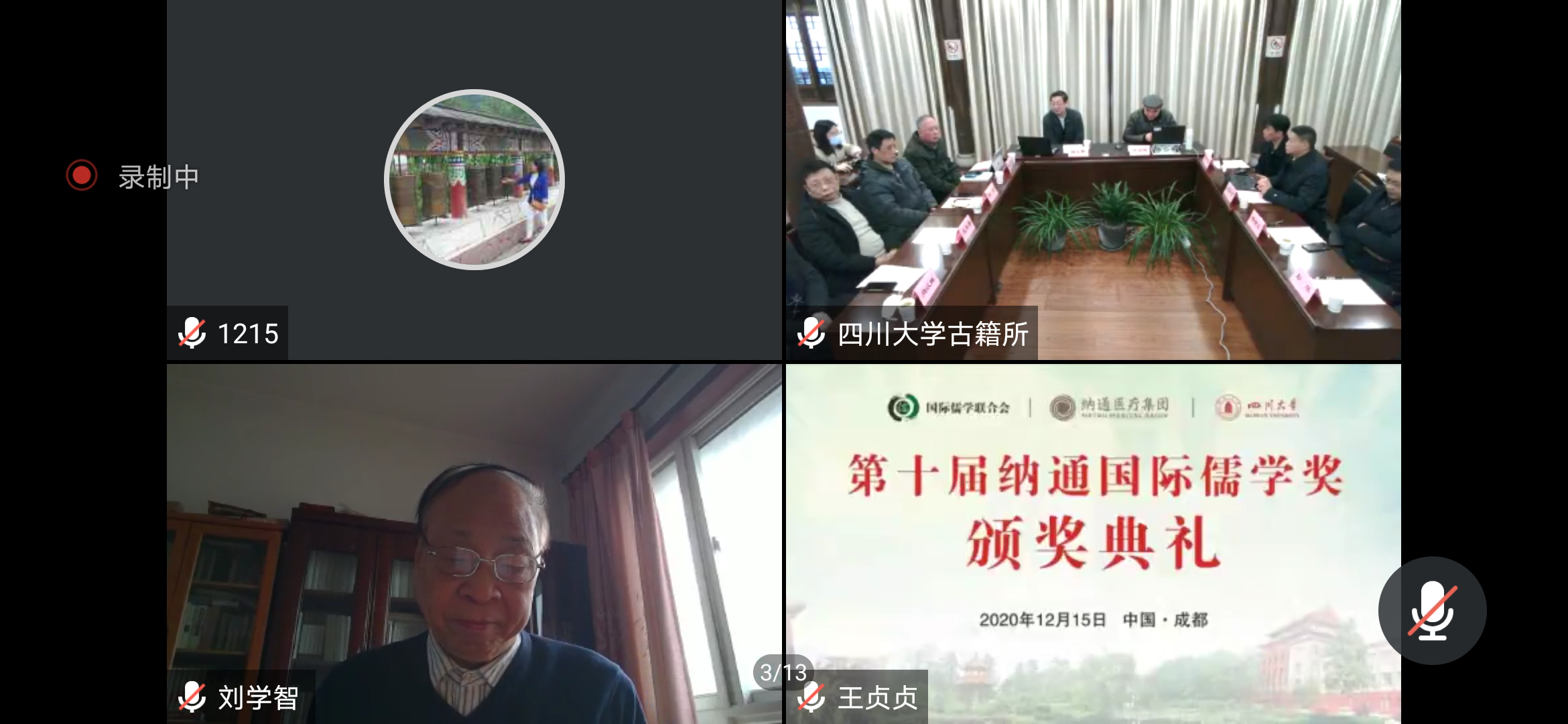 【本网讯】2020年12月15日上午,第十届“纳通国际儒学奖”在四川大学中华文化研究院隆重举行。由于防控新型冠状病毒肺炎疫情需要,本次颁奖分设四川大学和北京纳通集团总部两个分会场,采取线上线下相结合方式进行。国际儒学联合会副会长、四川大学国际儒学研究院院长舒大刚教授主持颁奖典礼。我院张晓英老师荣获“优秀征文奖”三等奖,在水磨镇参加本次云颁奖。